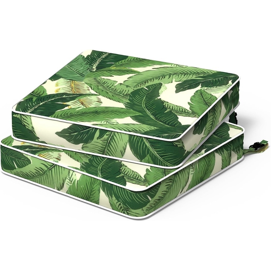 Reversible Outdoor Chair Cushions 19x19x3 Inch, Water Repellent Patio Seat Cushions with Straps, Set of 2, Green Palm Design