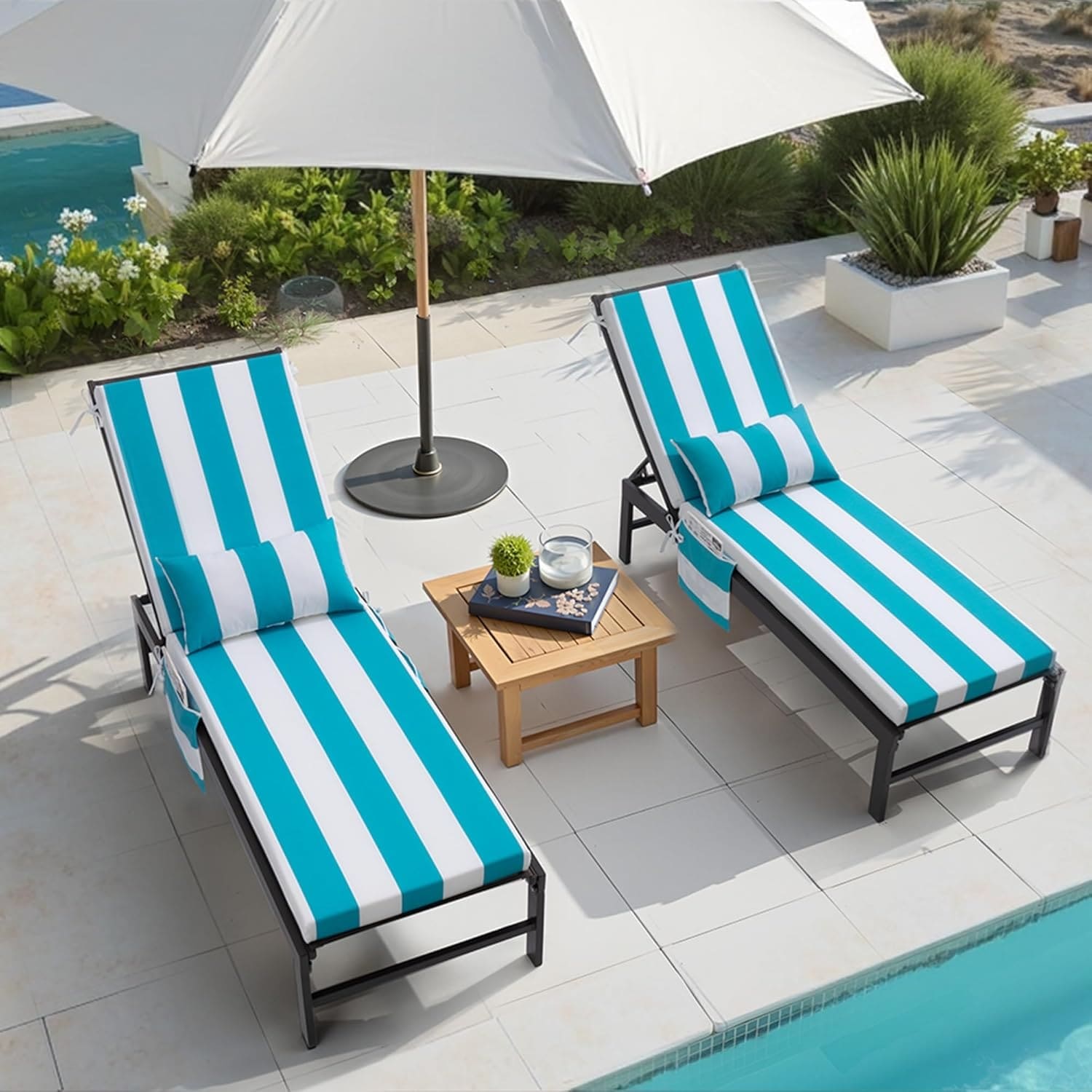 Set of 2 Water Repellent Outdoor Chaise Lounge Cushions with Head Pillow and Side Pockets, 72x21 Inches, Blue Stripe