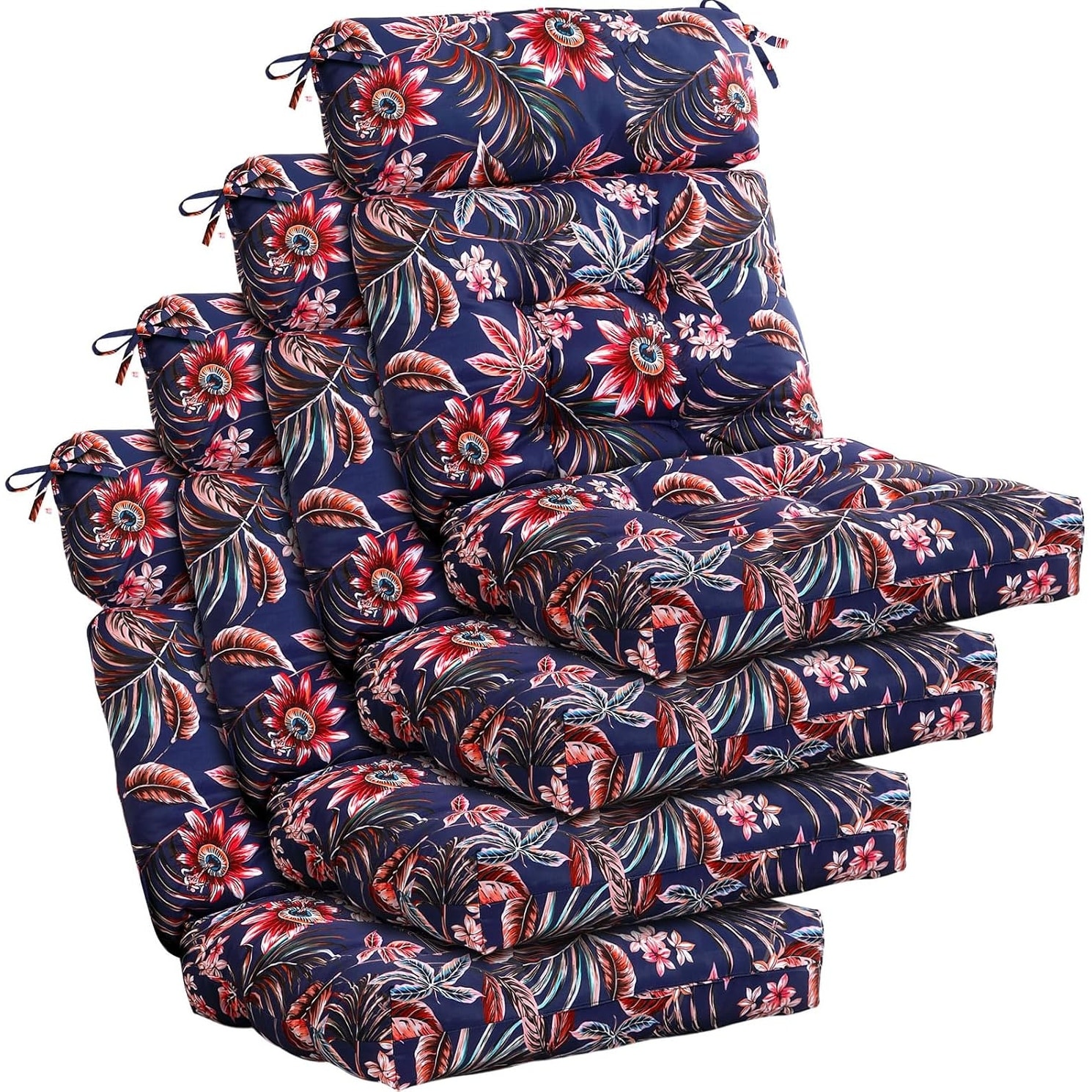 4-Piece Tropical Leaf Design High Back Chair Cushion Set with Ties for Indoor/Outdoor Rocking Chairs