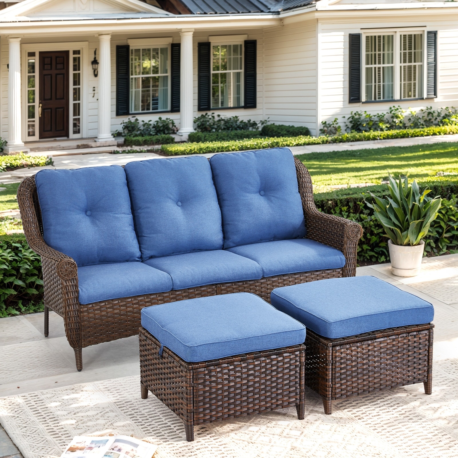 Outdoor Patio 3-Seat Sofa with 2 Ottomans Brown - Blue
