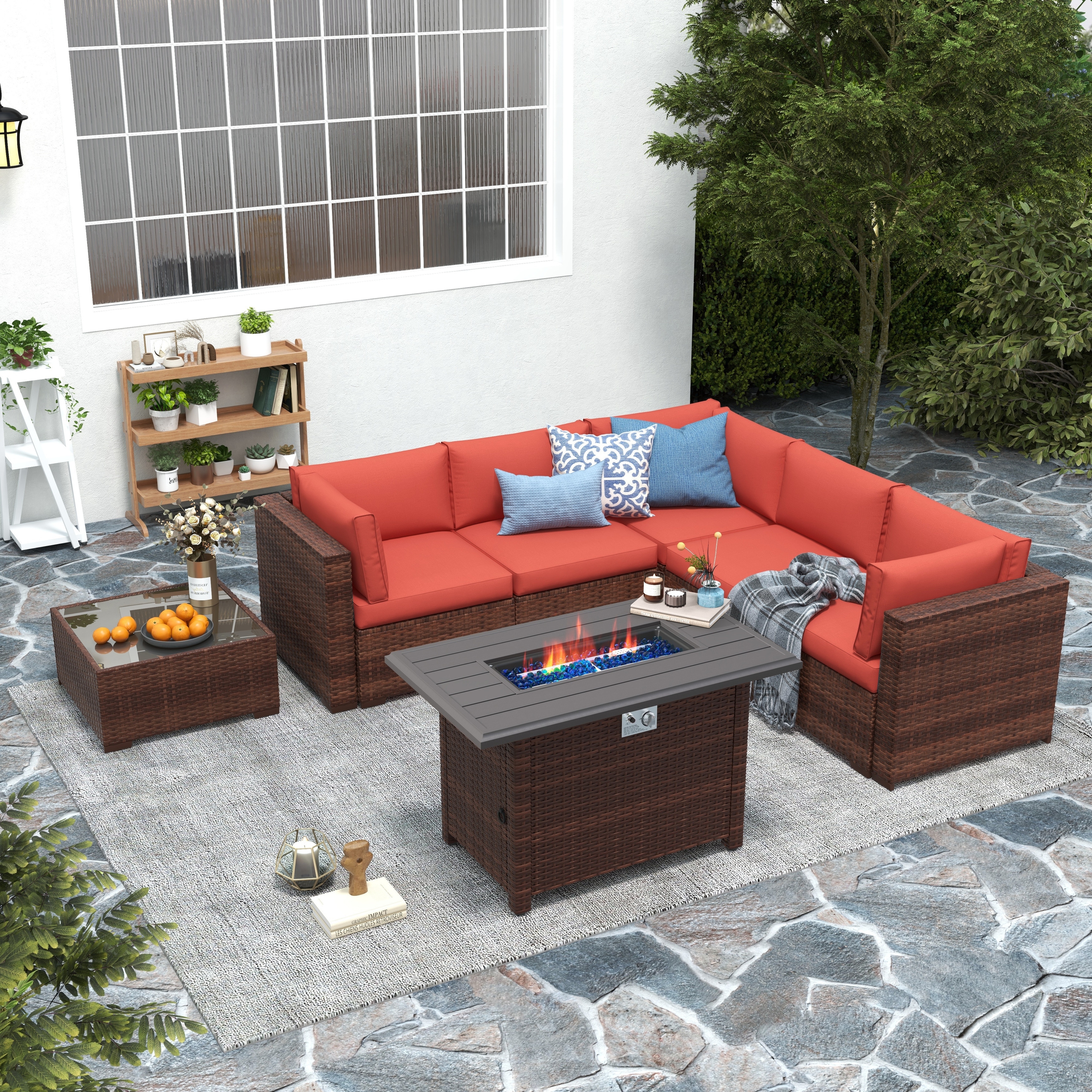 7 Piece Wicker Set Patio Sofa Furniture with Fire Pit And Table