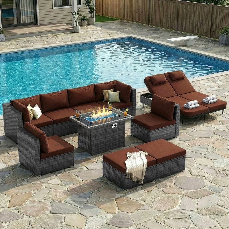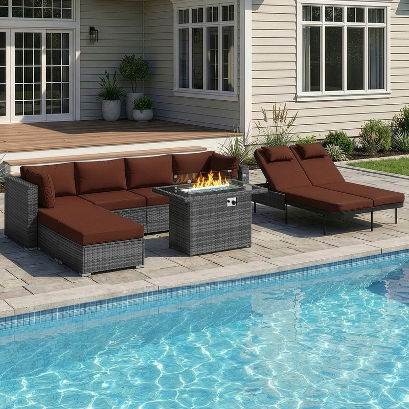 Outdoor Sectional Conversation Set PE Wicker with Double Chaise Lounge, 60,000 BTU Fire Pit Table