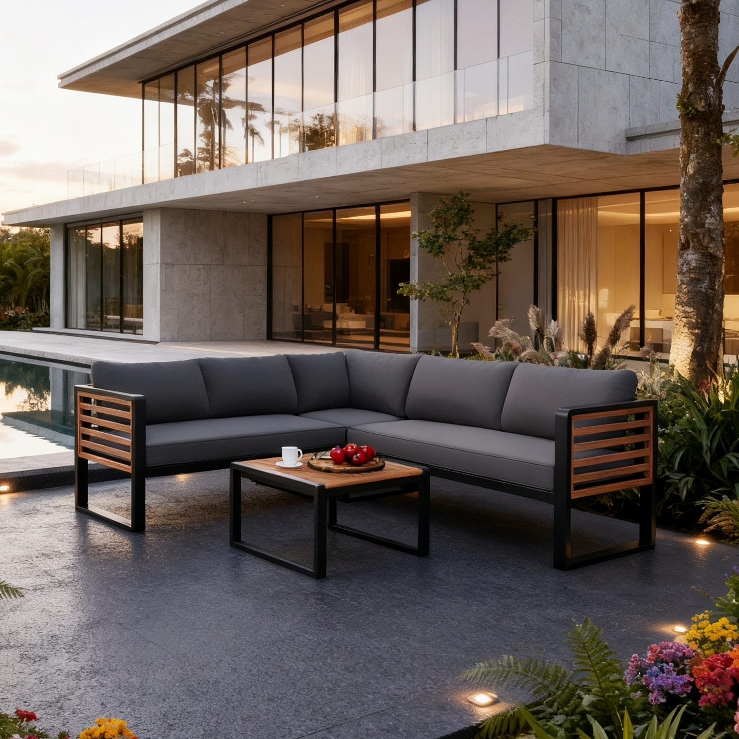 4-Piece Outdoor Metal L-Shaped Conversation Sofa Set with Coffee Table
