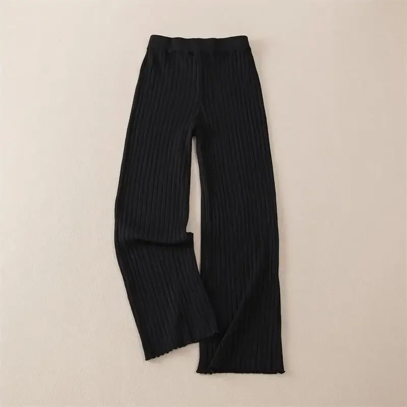 Women Autumn Winter Thick Knitted Pant, Wide Leg Fashion Straight Trousers, Casual Elastic Knit Pants Striped Pantalon black one Size
