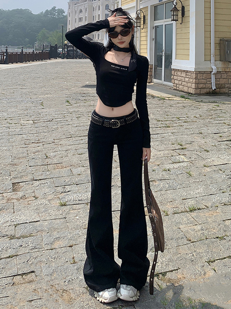 High Quality Korean Low Rise Bell Bottom Jeans, Winter Women Simple Flared Pants, Y2K Cowboy Skinny Denim Bootcut black xs