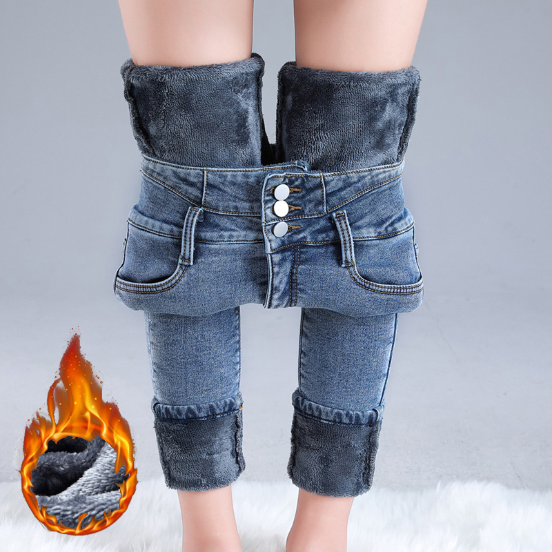 Women Thermal High Waist Jeans, Winter Snow Warm Plush Denim, Stretch Skinny Thick Fleece Fur Pants For Ladies retro blue 29