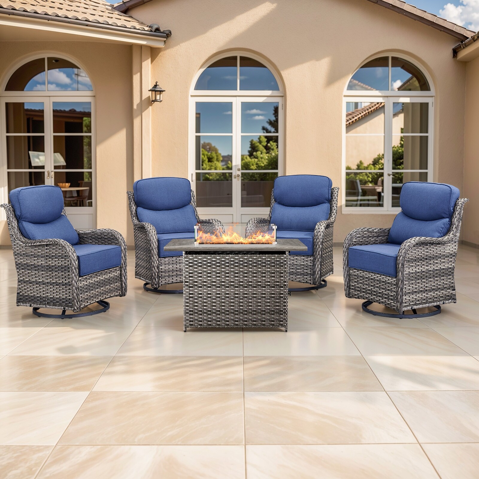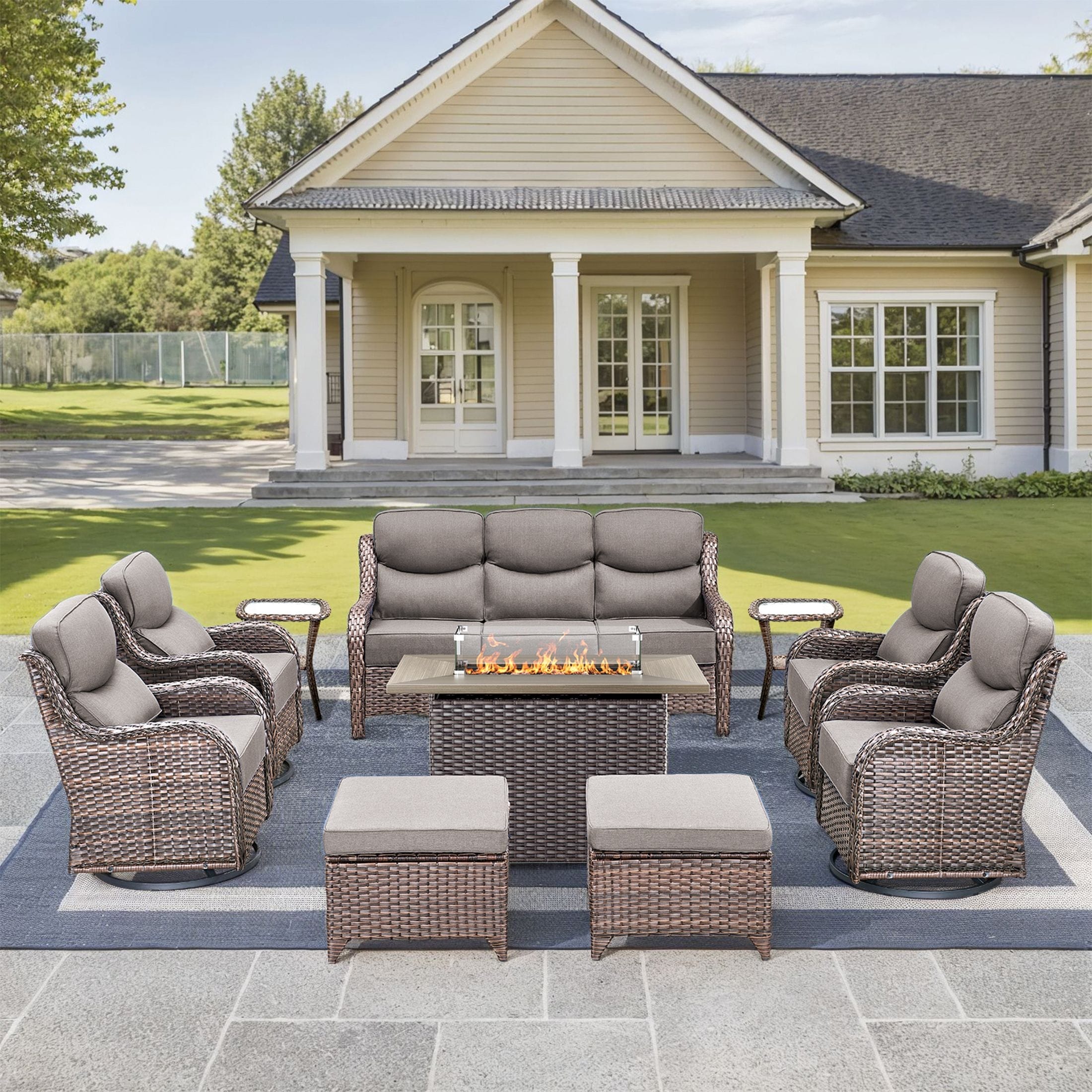 Outdoor Sofa Swivel Chairs Ottomans and Fire Pit Table