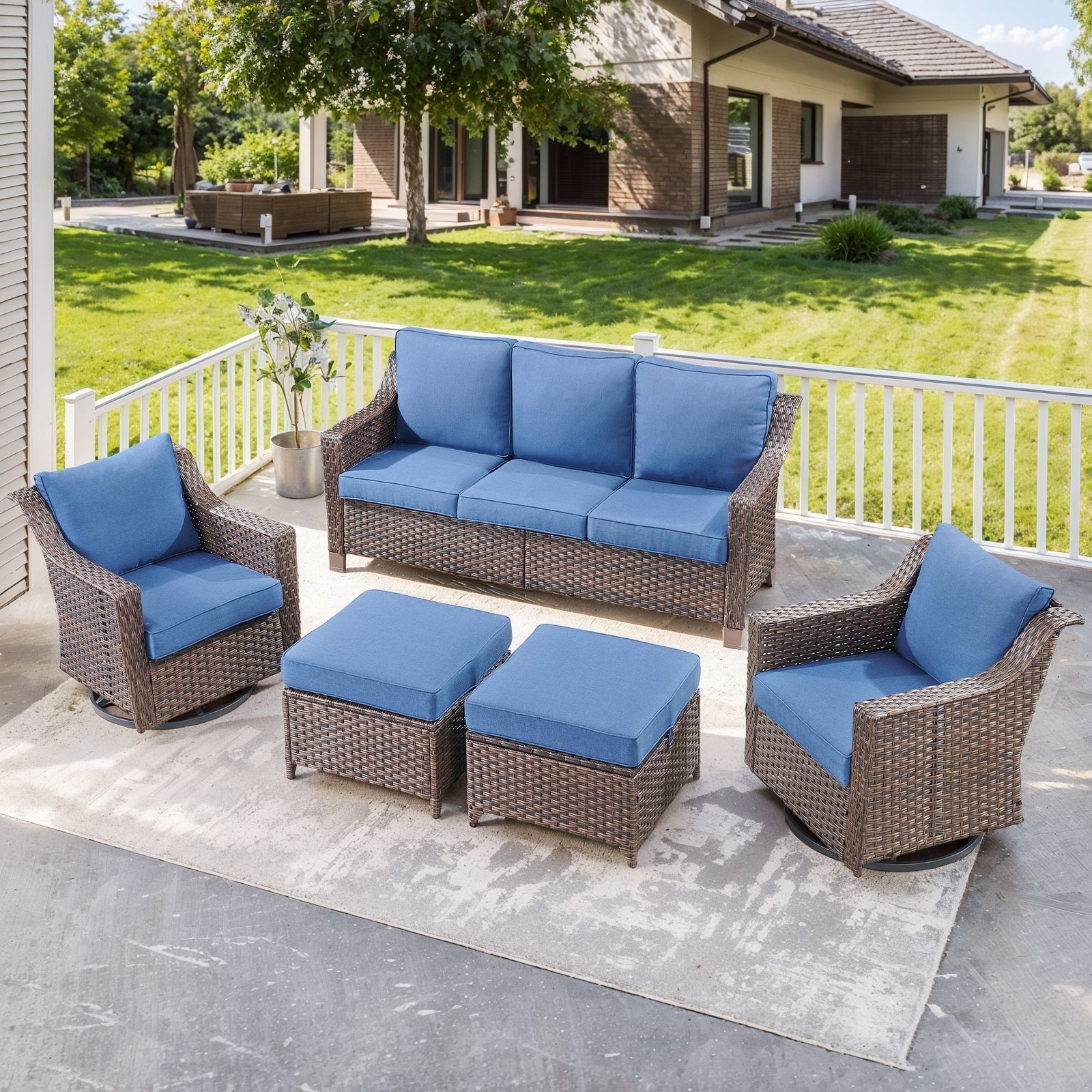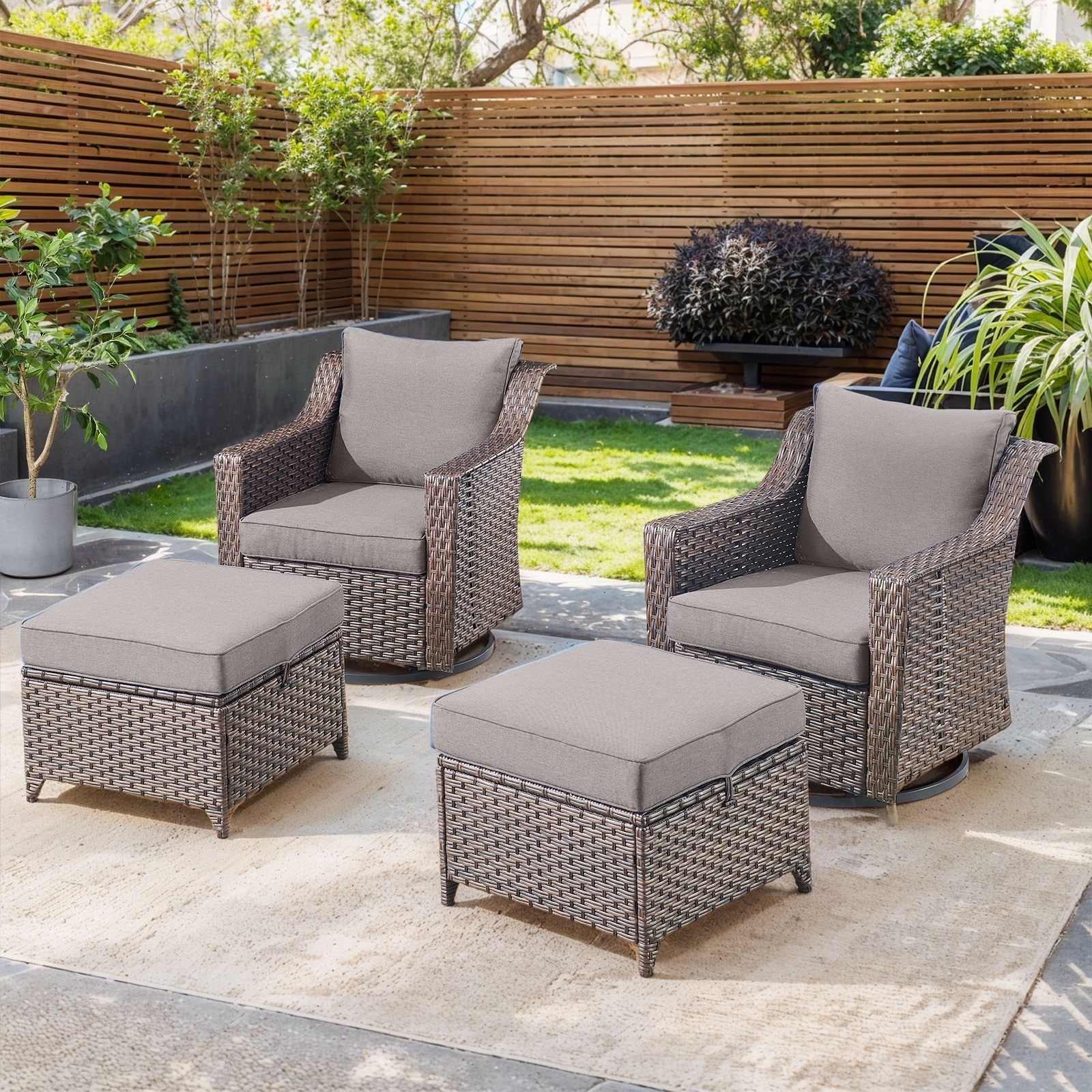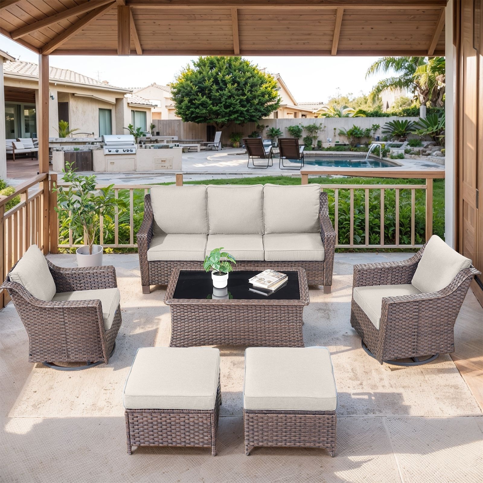 Gymojoy 7 Pieces Patio Sofa with Rattan Swivel Rocking Chair Ottomans Outdoor Conversation Set