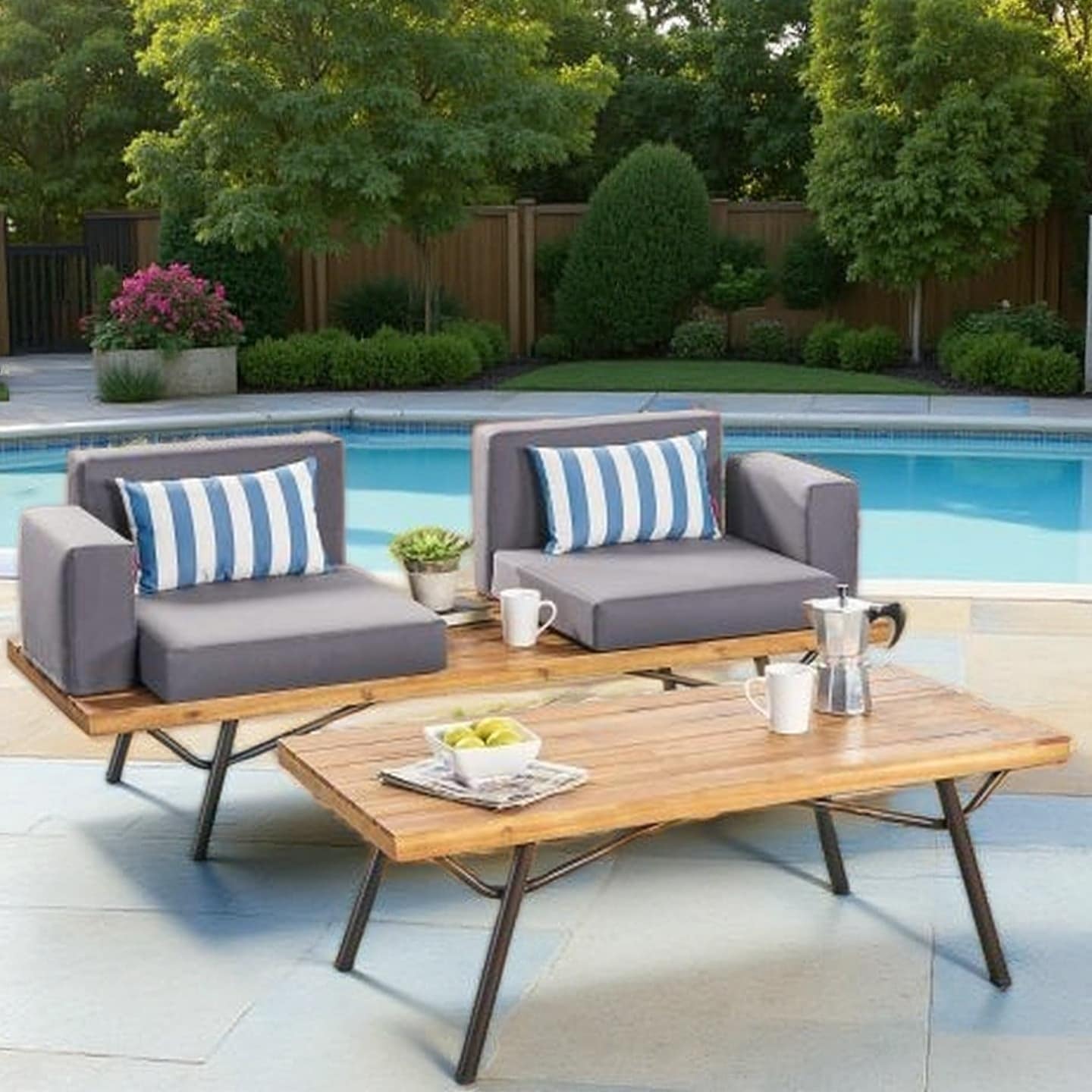2-Piece Outdoor Industrial Patio Set with Acacia Wood Coffee Table and Dark Gray Cushioned Loveseat