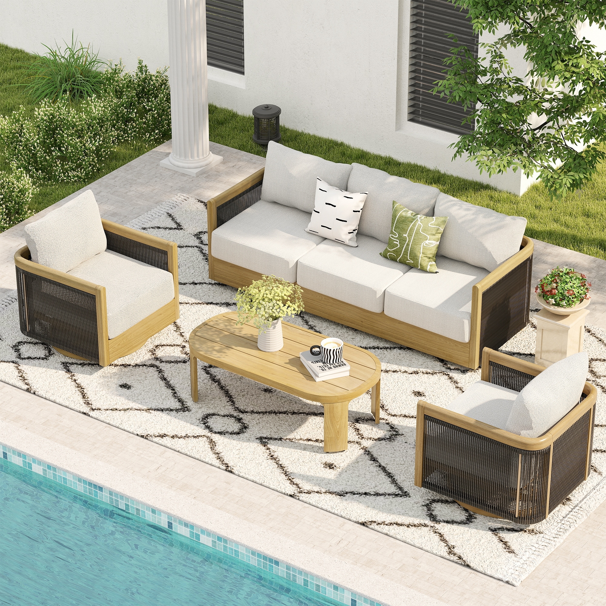 Overture 4-Piece Natural Wood Grain Aluminum Hand-Woven Rope Patio Conversation Set with Swivel Chairs, Cushions, Coffee Table