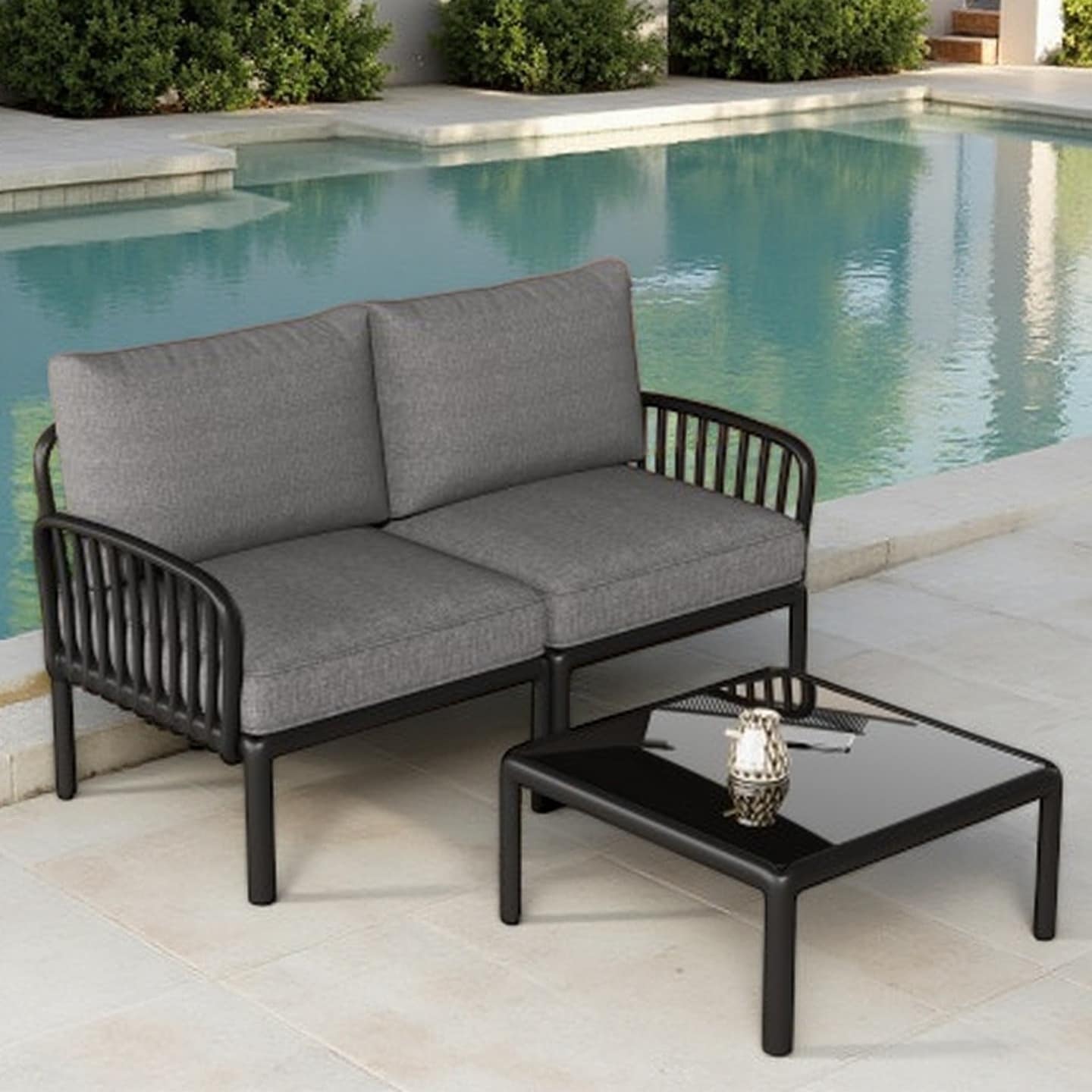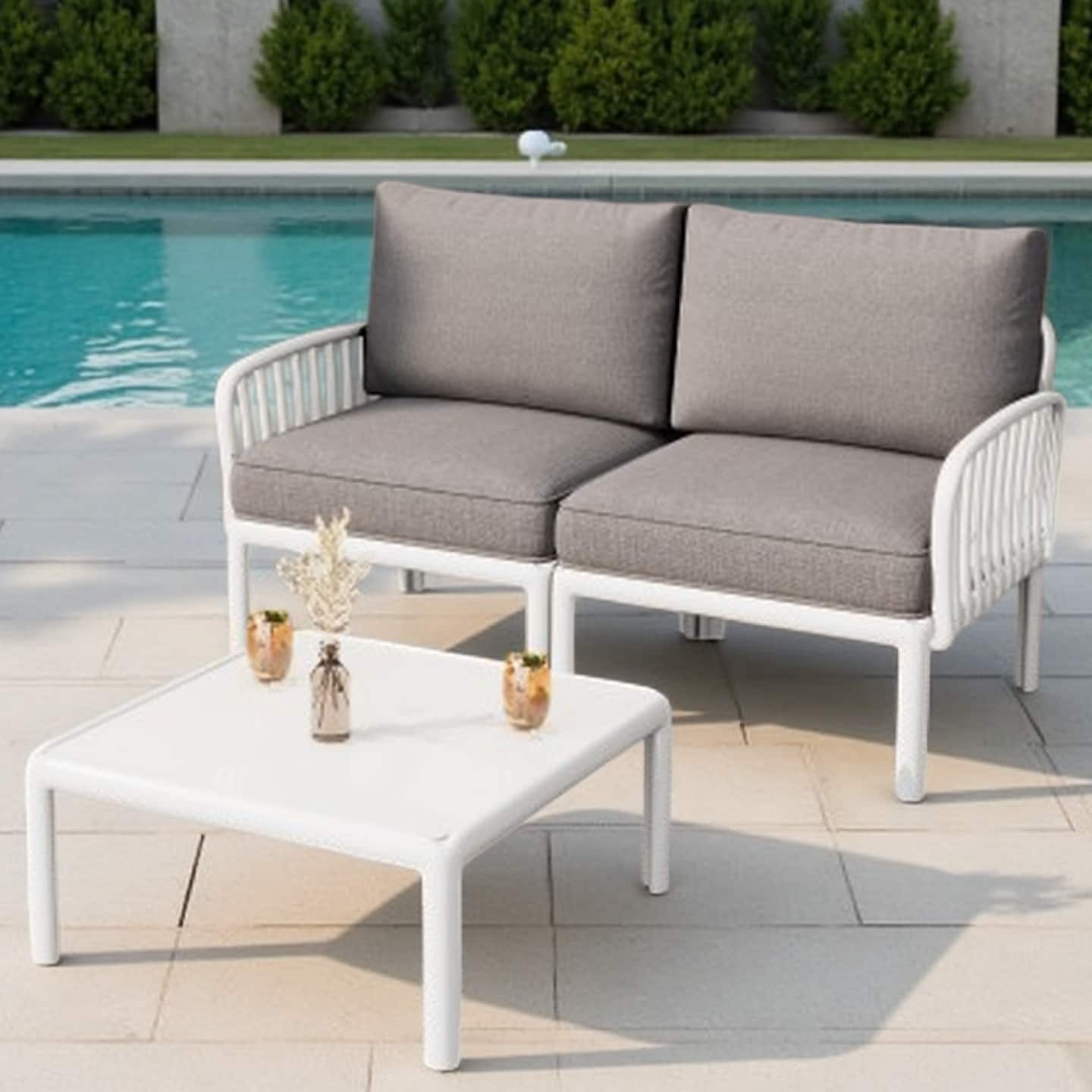 Right-Arm Acacia Wood Outdoor Loveseat and Coffee Table Set with Slatted Design and Water-Resistant Cushions