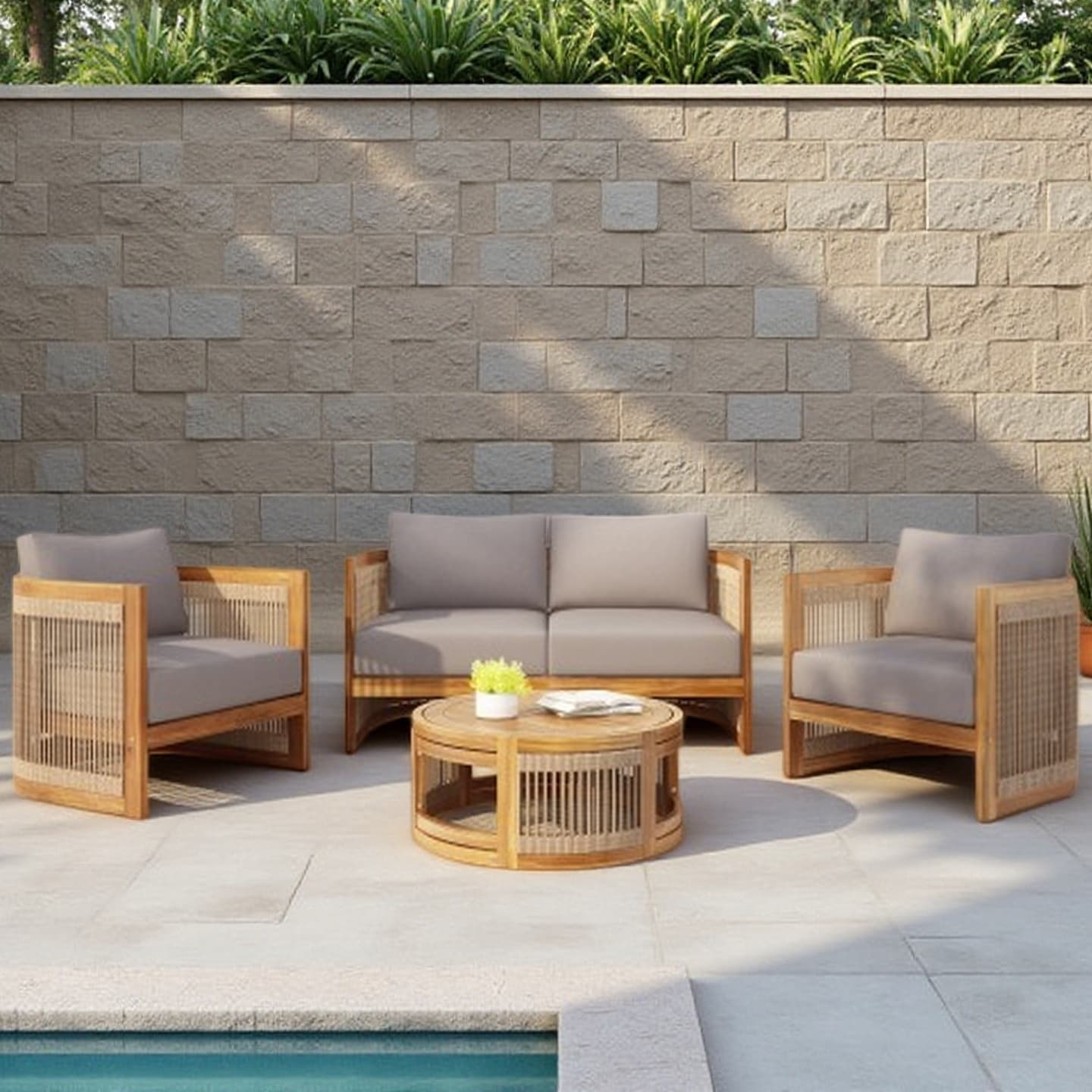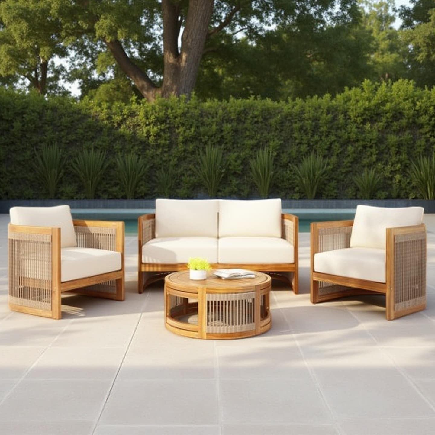 4-Piece Outdoor Acacia Wood Patio Set with Loveseat, 2 Chairs & Coffee Table, Water-Resistant Cushions