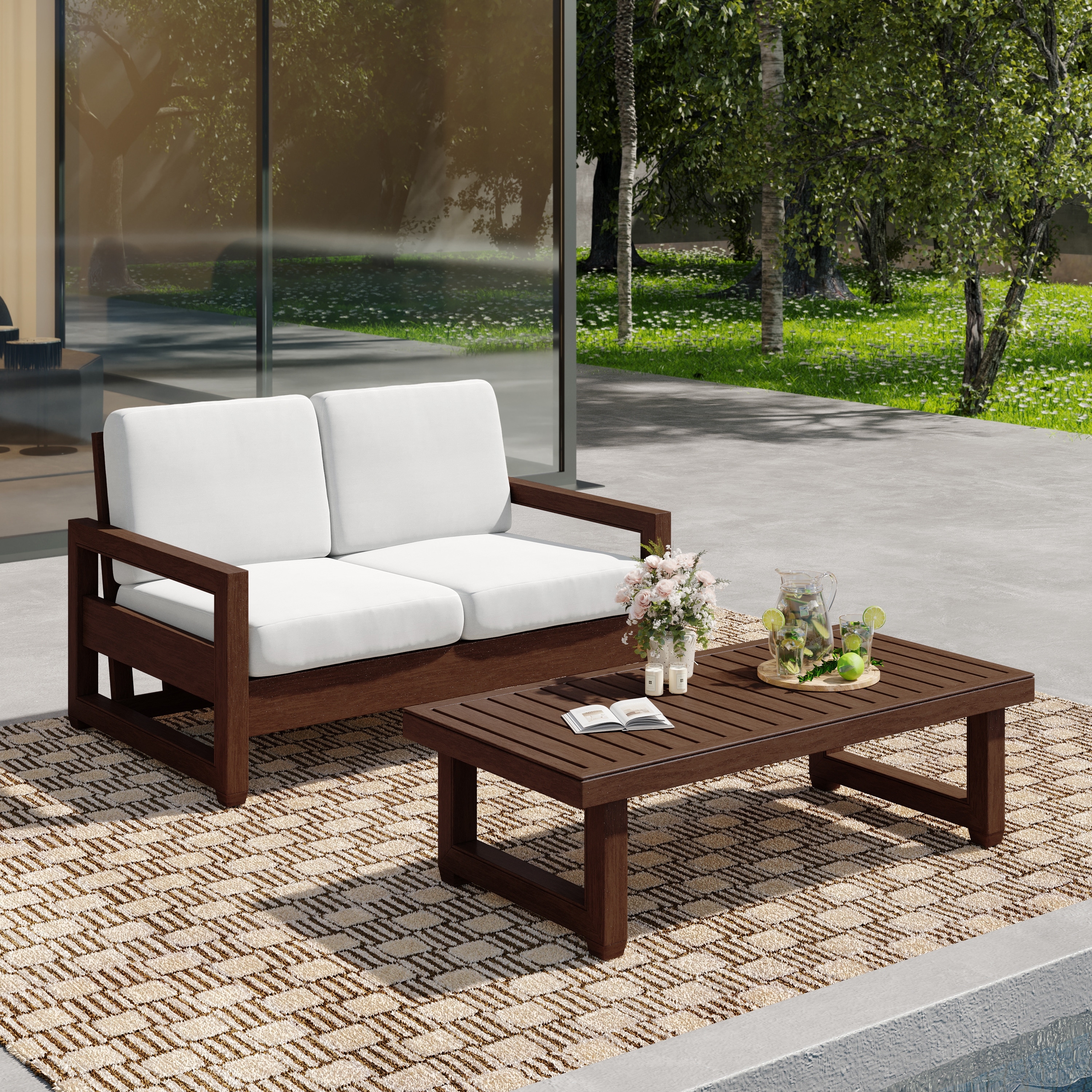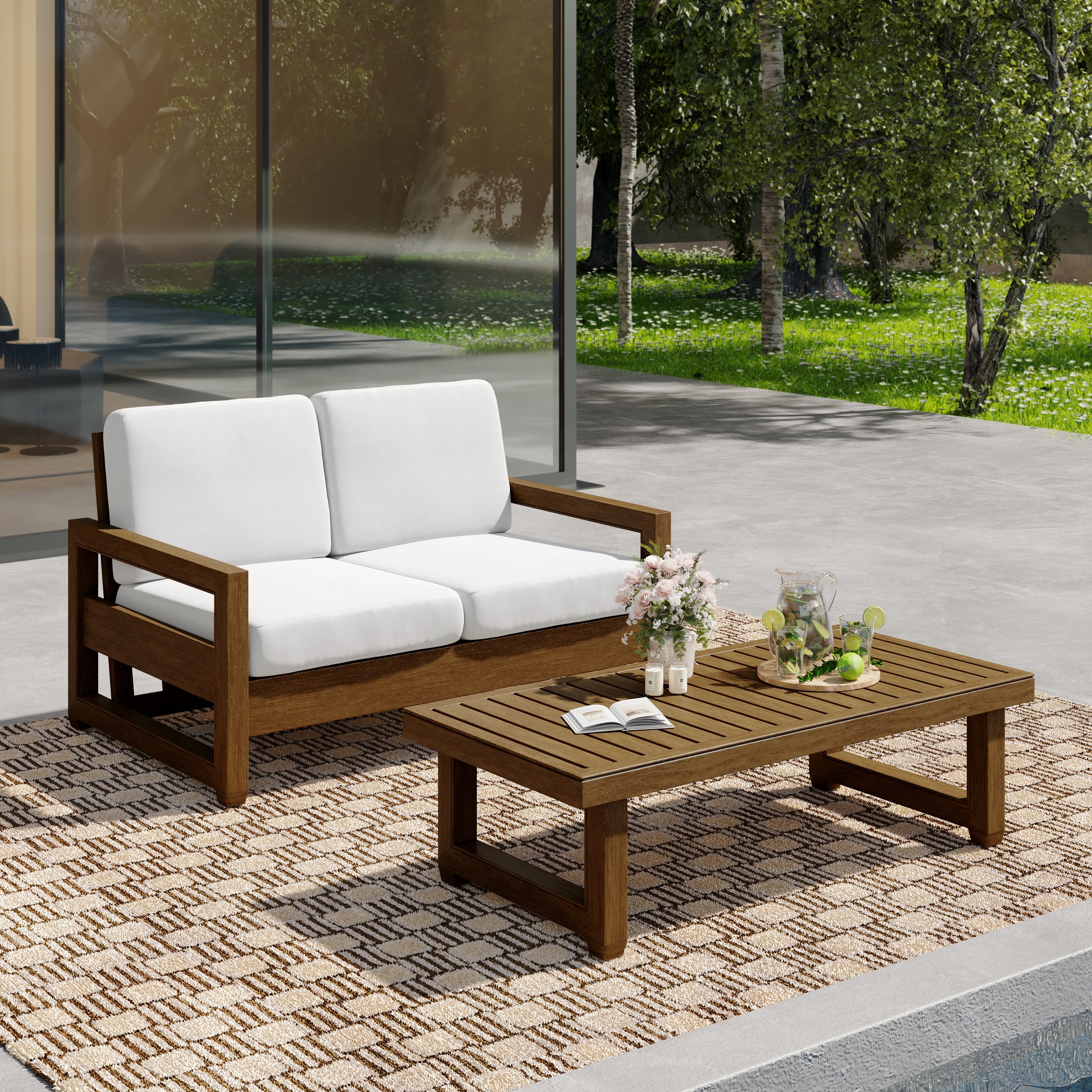 Outdoor Loveseat Sofa with Coffee Table Teak Wood Patio Furniture
