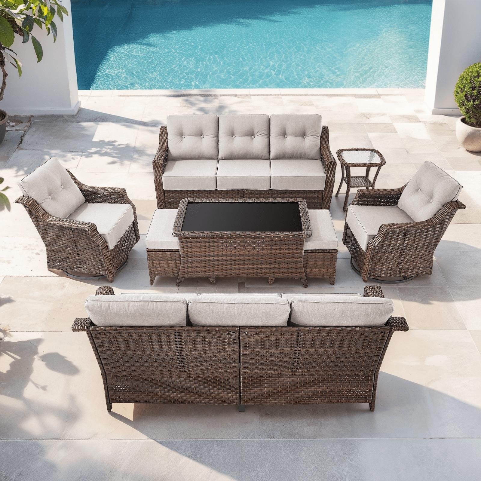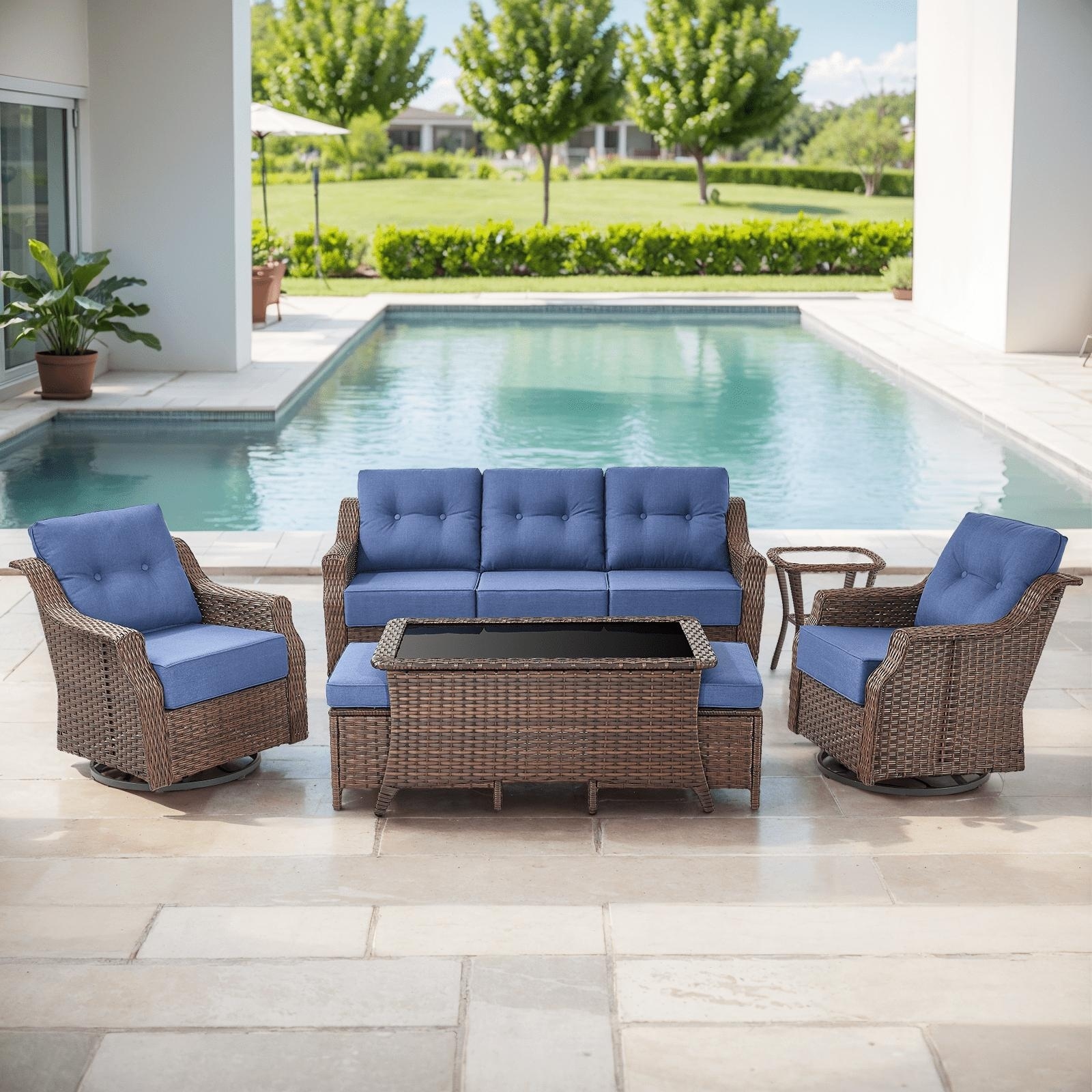 Meyreso 7-Piece Wicker Patio Conversation Set with Swivel Gliders and 6-Inch Thick Cushions