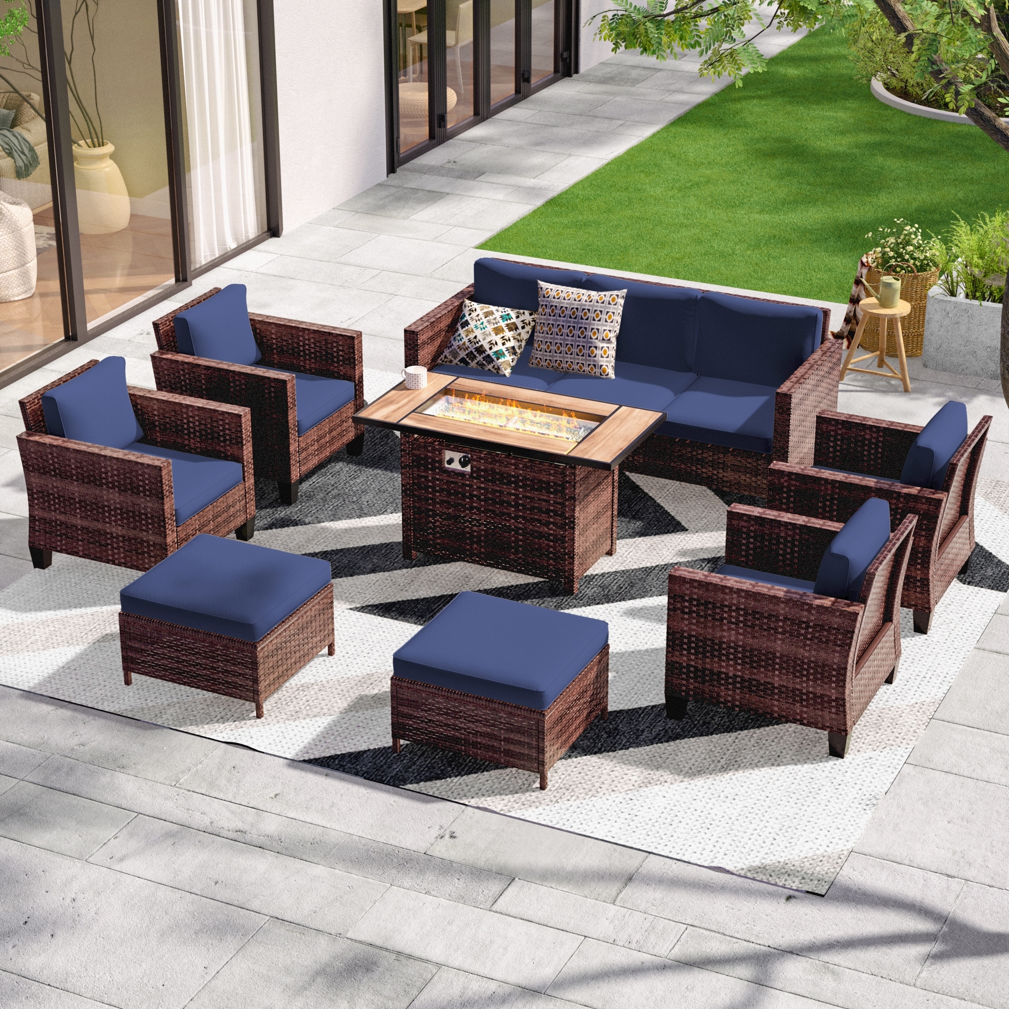 Livoosun 8 Pieces Patio Sofa with 45'' Fire Table Set, PE Wicker, Wide Armrests High Back Sofa Chair Design for Lawn, Patio