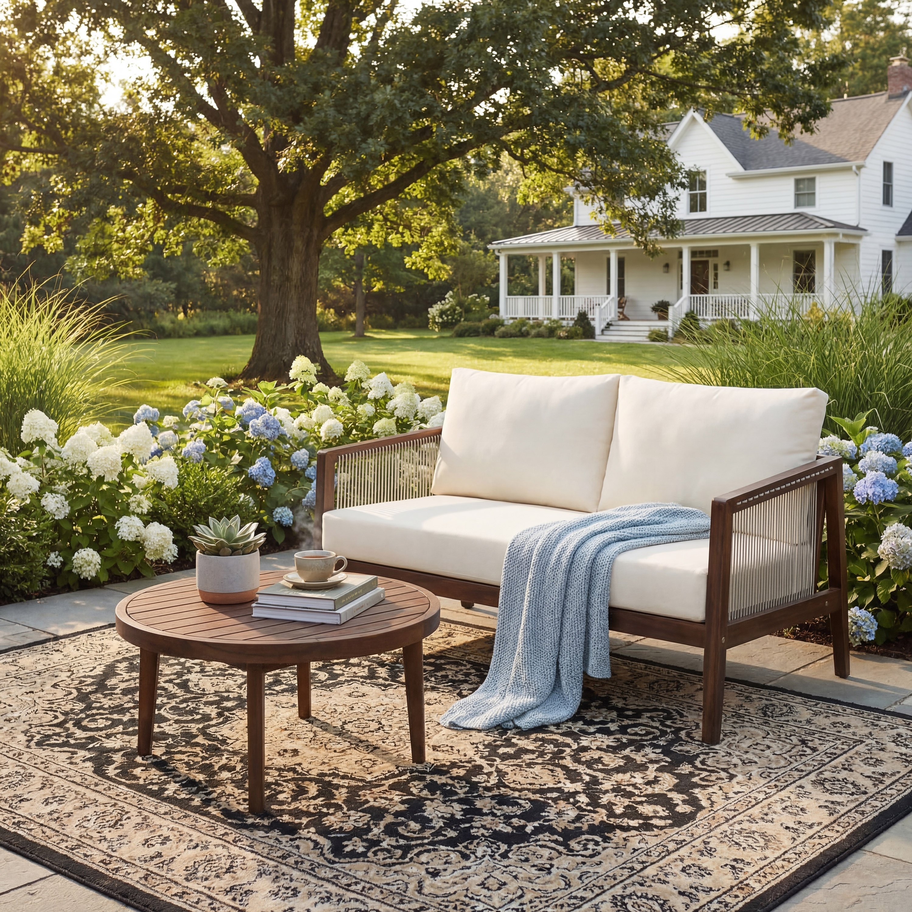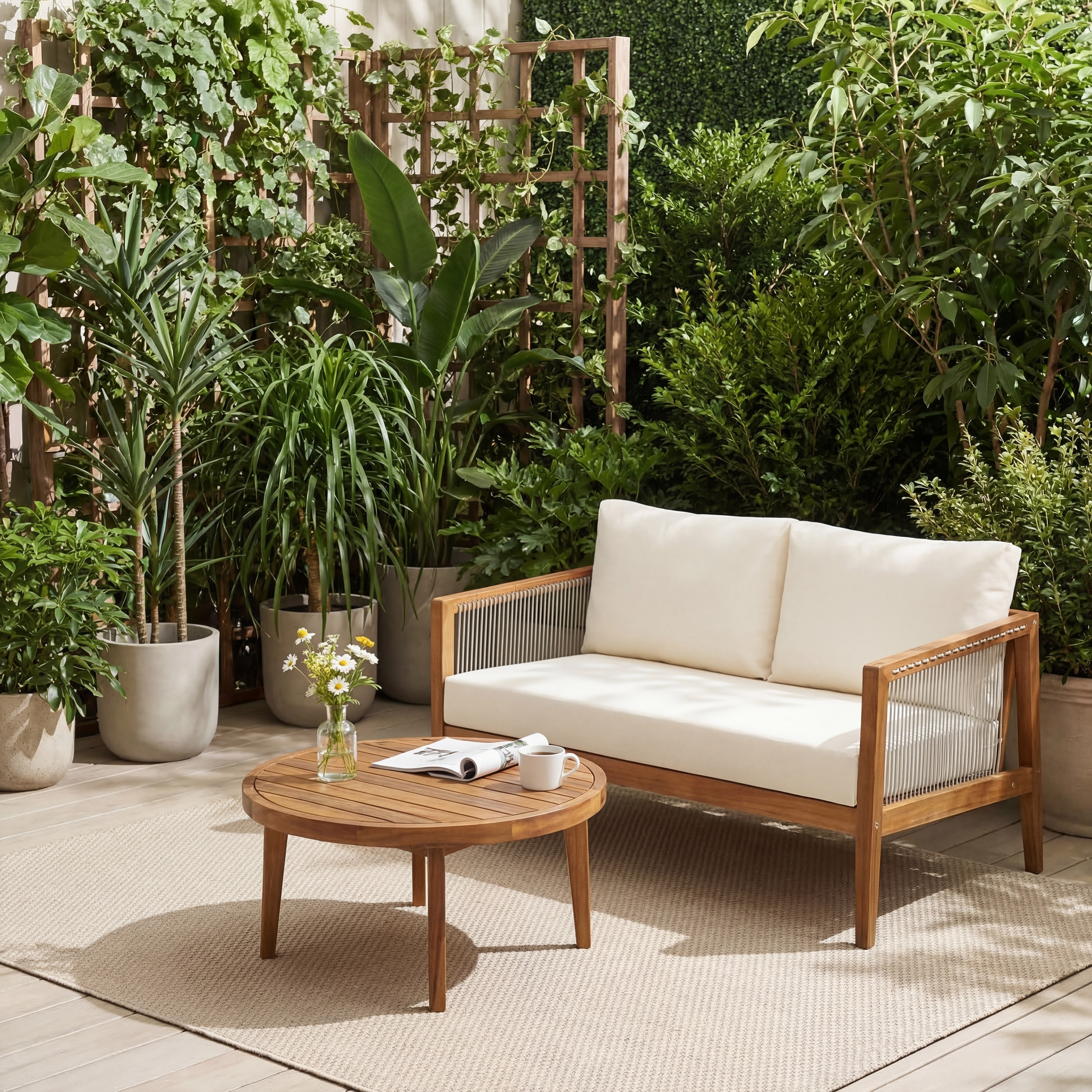 Christopher Knight Home - Modern 2-Piece Patio Acacia Wood Loveseat Conversation Set with Rope-Woven Panels, Coffee Table