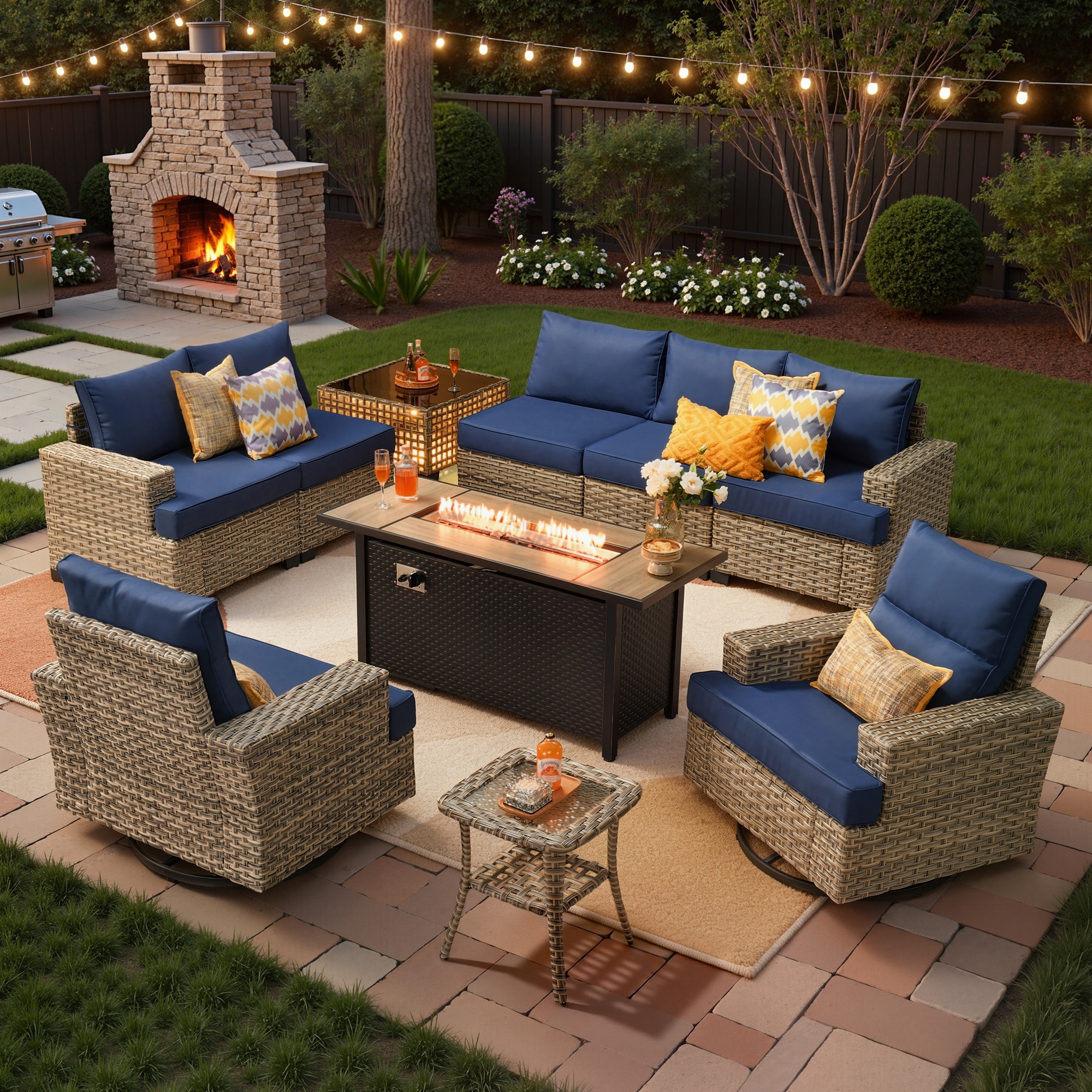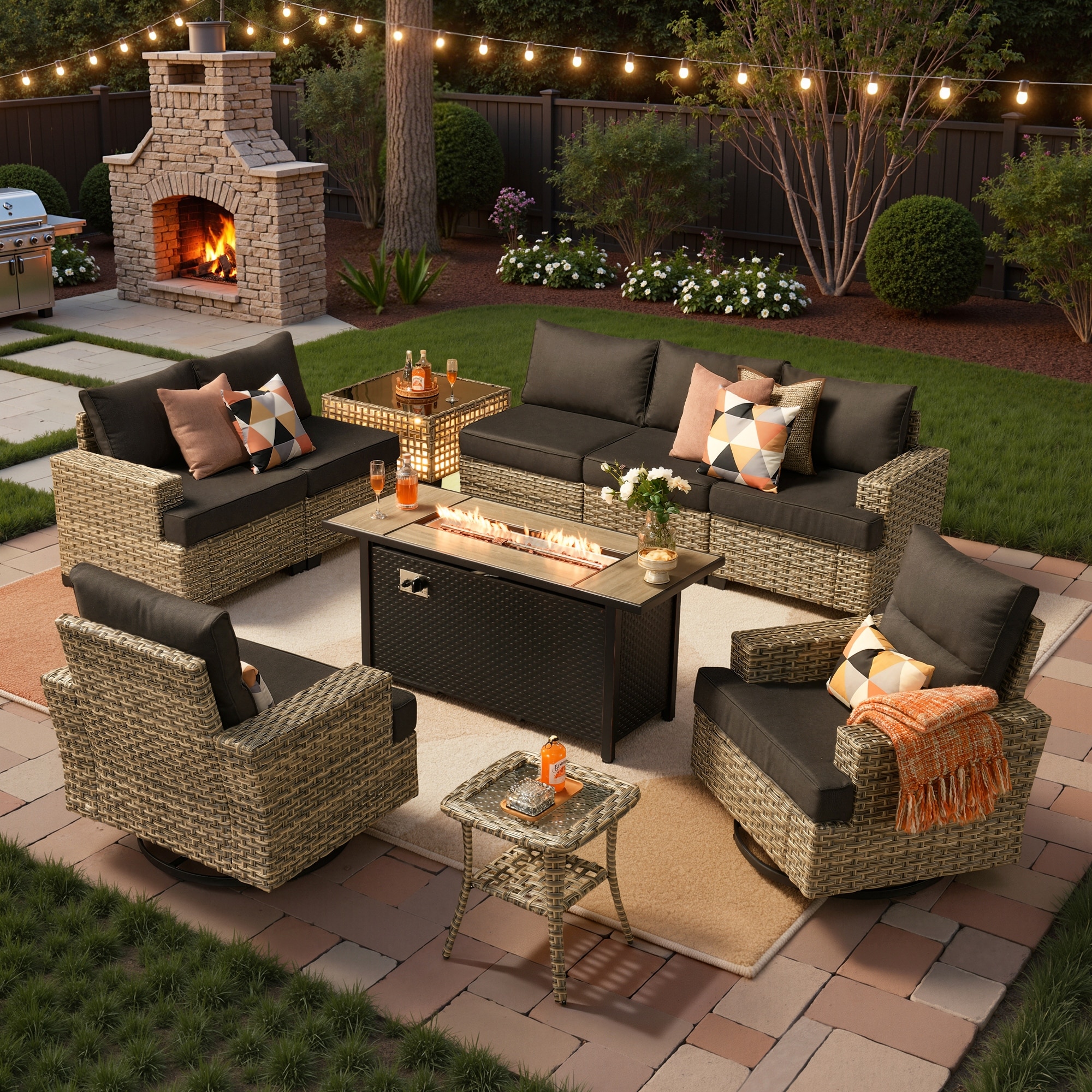 OVIOS 7-piece Patio Wicker Swivel Rocking Chair Set With Fire Pit