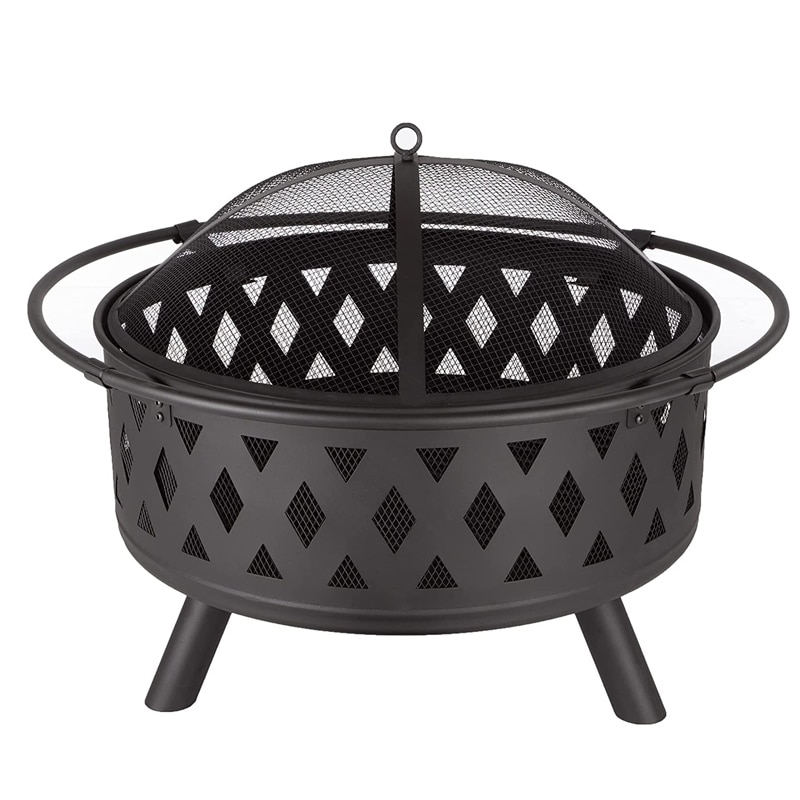 Round fire pit with net cover, fire poker, diamond mesh, metal wood burning outdoor fire pit