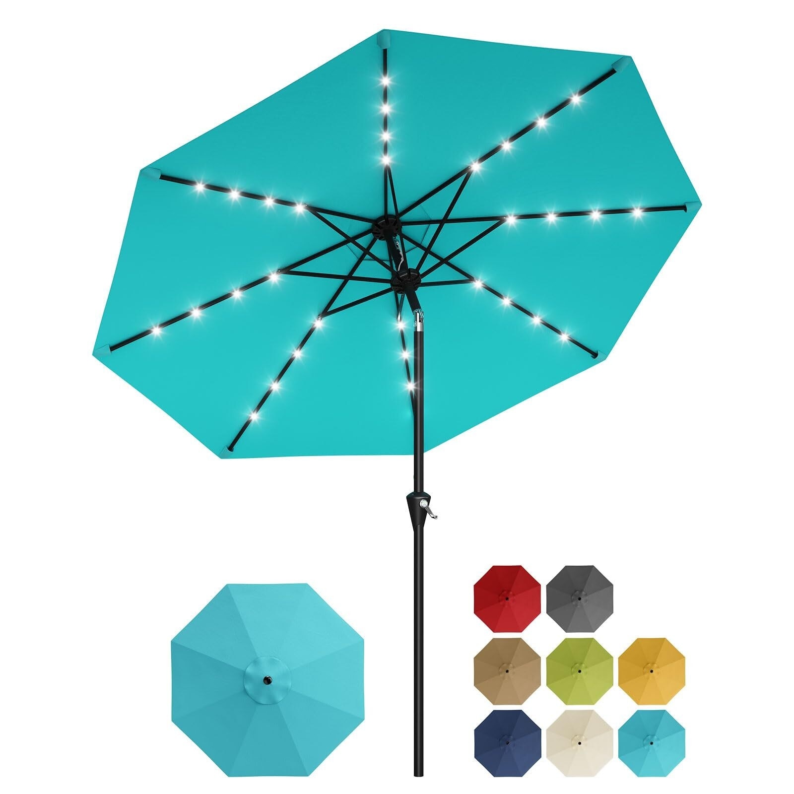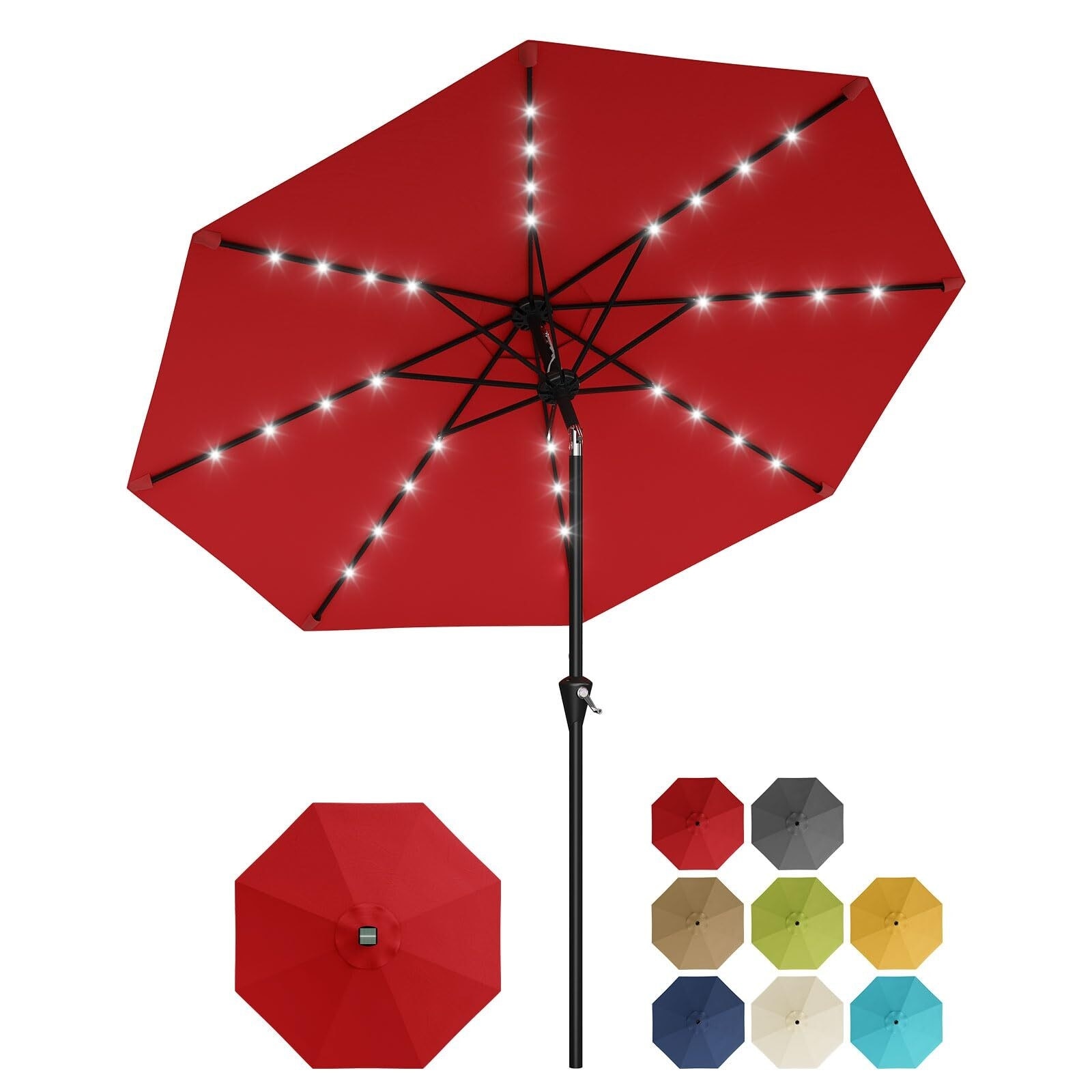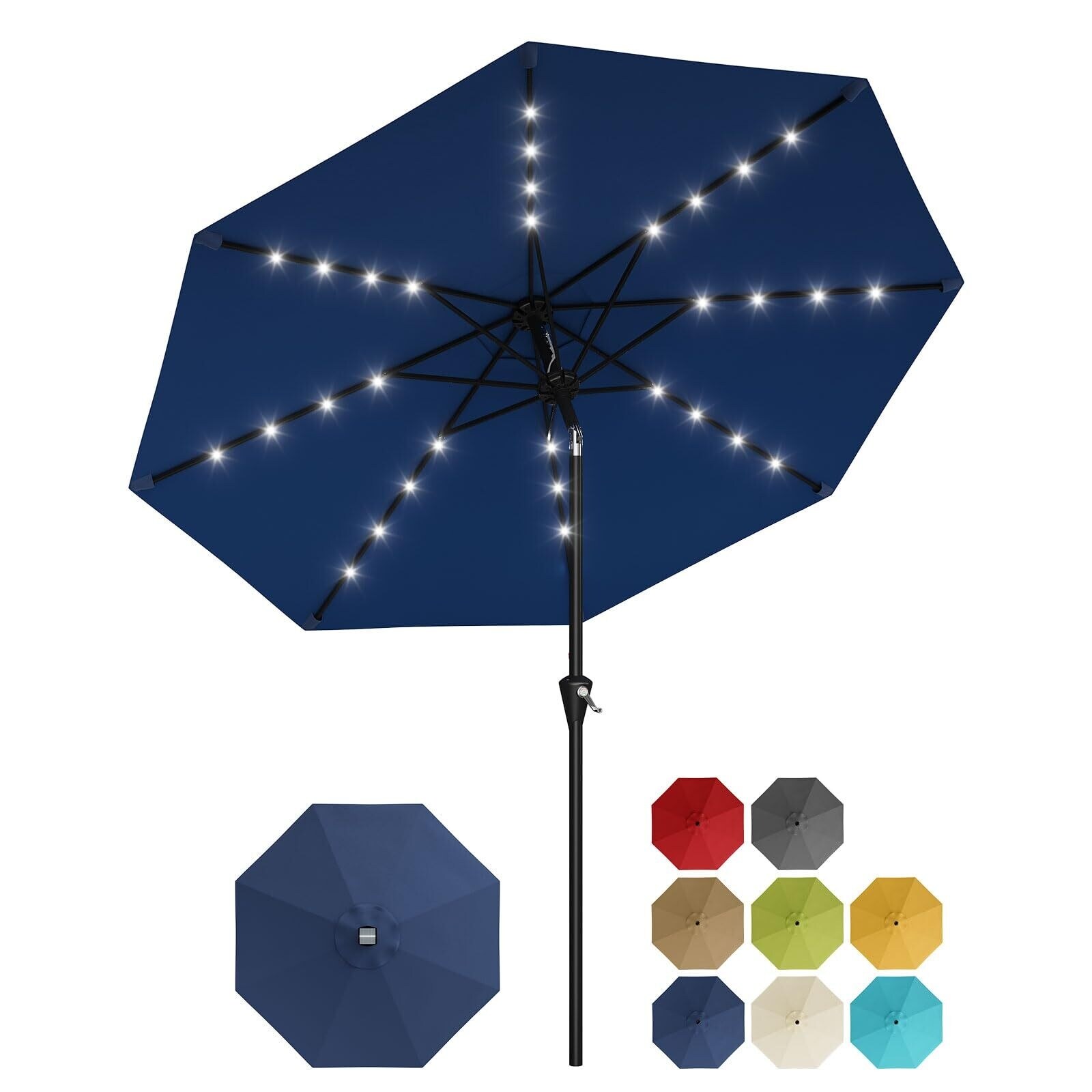 10FT Solar Patio Umbrella with 32 LED Lights - Outdoor Table Umbrella with Crank Lift, Push Button Tilt and 8 Sturdy Ribs