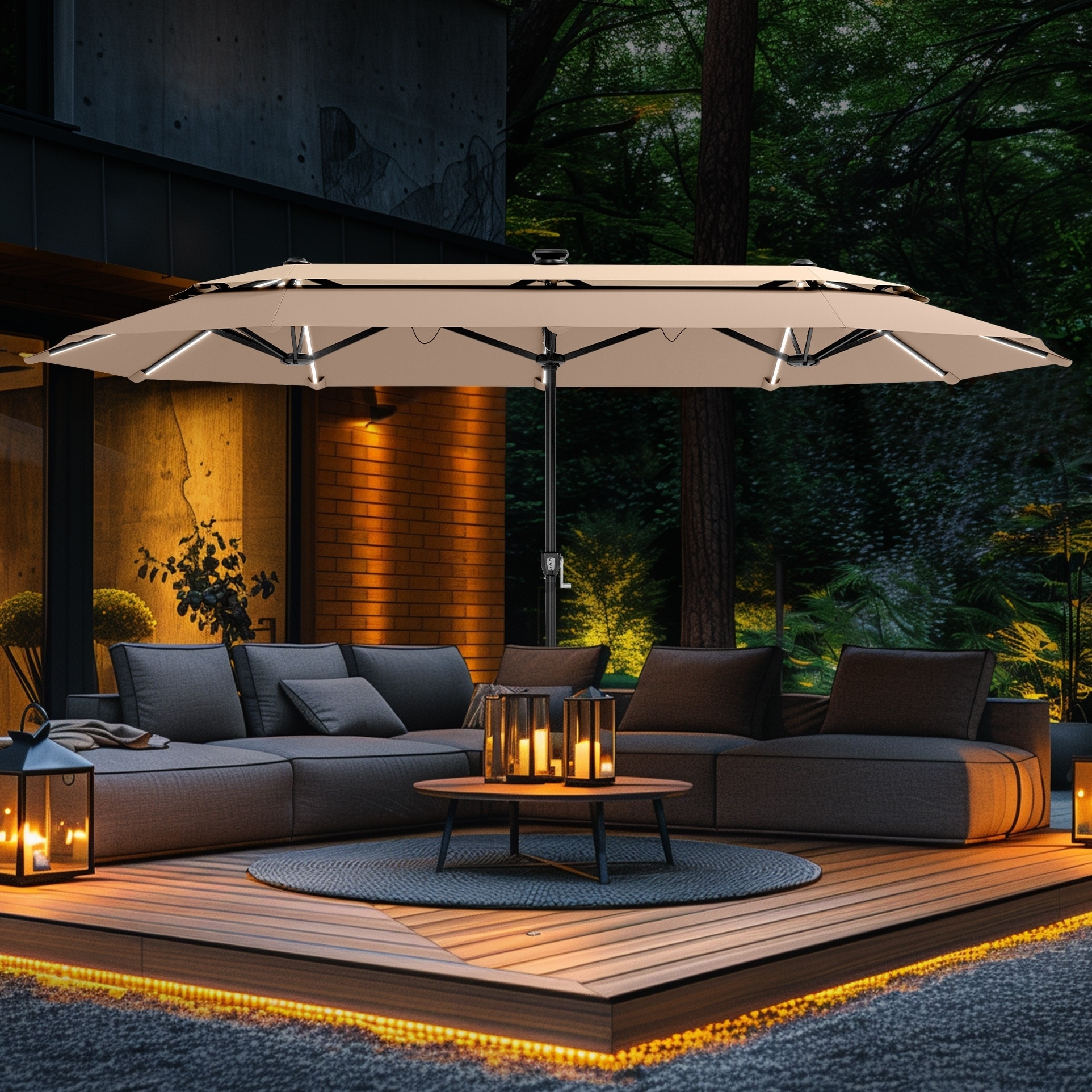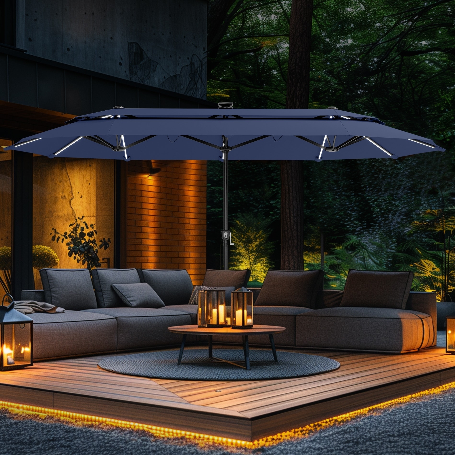 MAISON ARTS 13ft Double-Sided Outdoor Umbrella, 2-Tier Vented Market Umbrella with Colored Lights and Base
