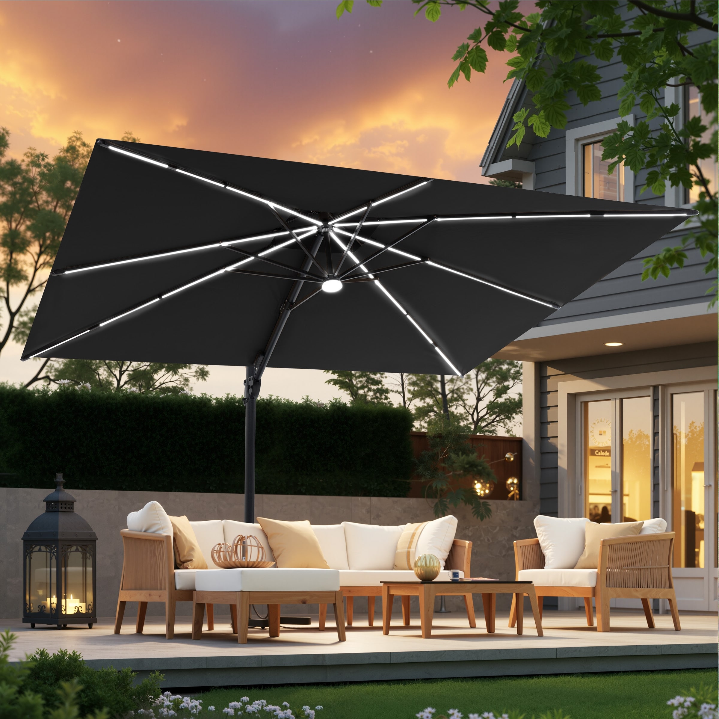 9 X 11 FT Outdoor Patio Cantilever Umbrella with Solar Lights Double Canopy 360 Rotation Tilt