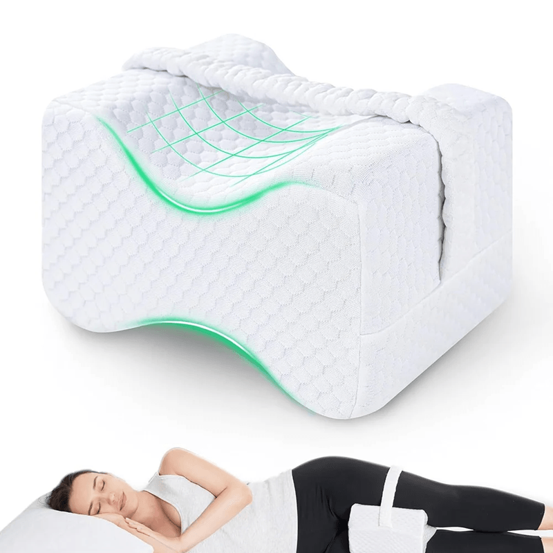 Memory Foam Knee Pillow For Side Sleepers With Adjustable Strap white