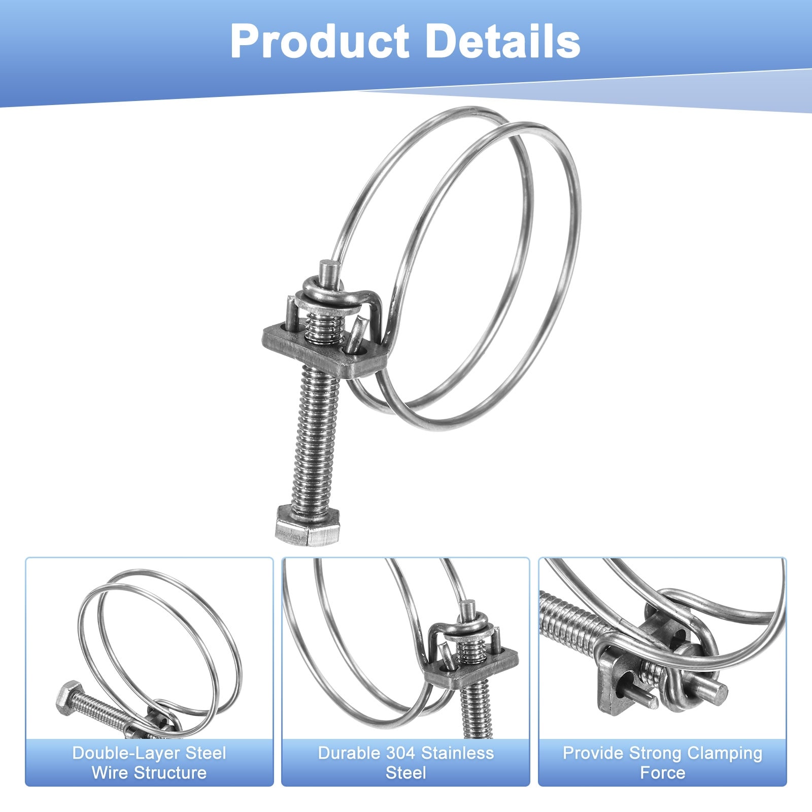 Double Wire Hose Clamp, Stainless Steel Hose Clips Pipe Tube Clamps with Bolt Adjustable for Dust Collection Hose - Silver