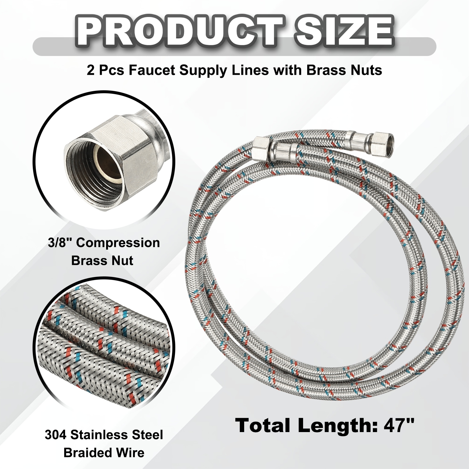 Braided Supply Connector, Steel Faucet Supply Lines Faucet Hose with Brass Nuts for Kitchen Bathroom - Silver Tone