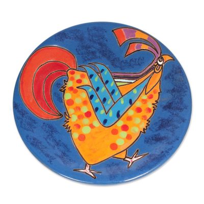 Yellow Rooster,'Handcrafted Yellow Rooster on Blue Ceramic Decorative Plate'