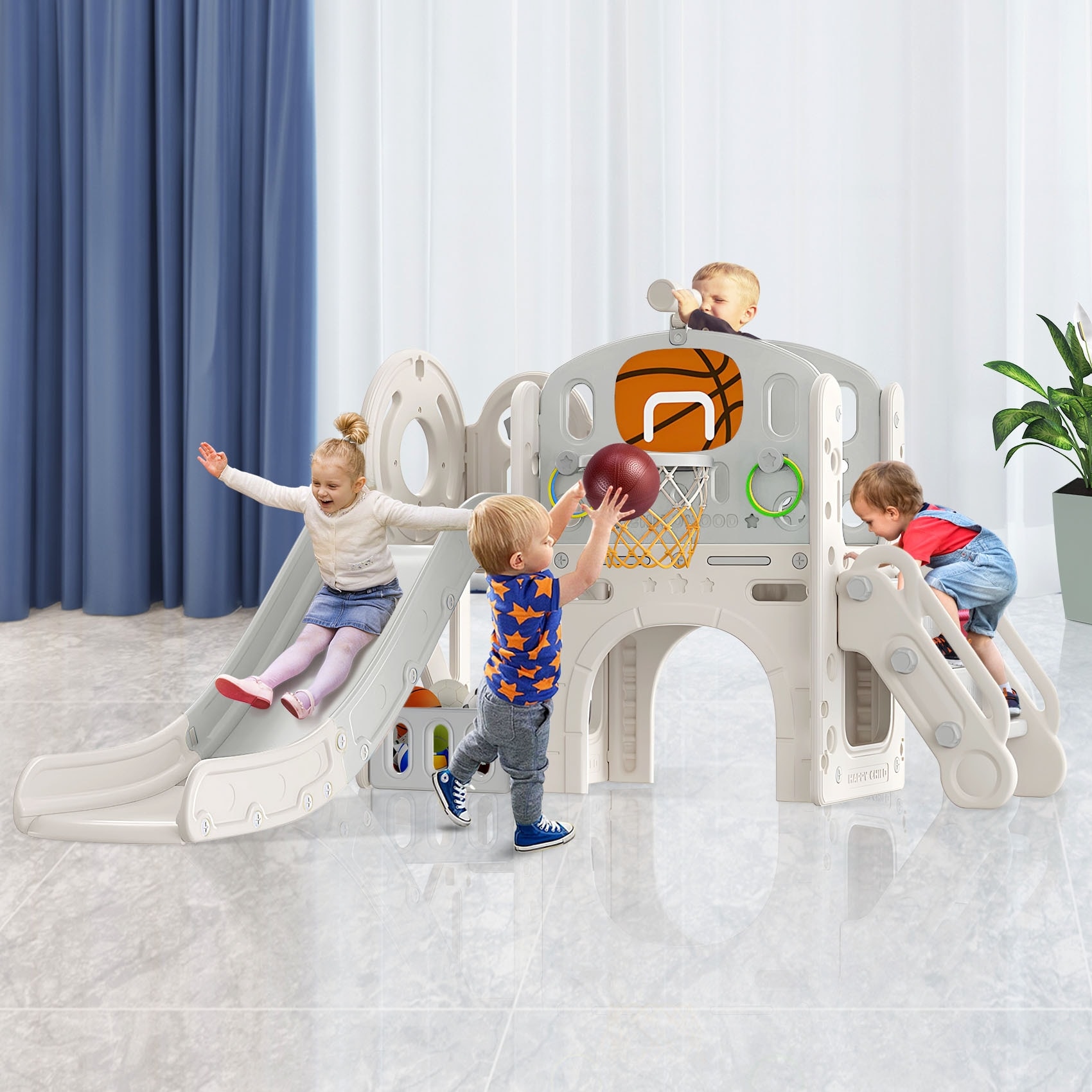 6-in-1 Indoor Toddler Slide Playset w/Basketball Hoop Telescope & More