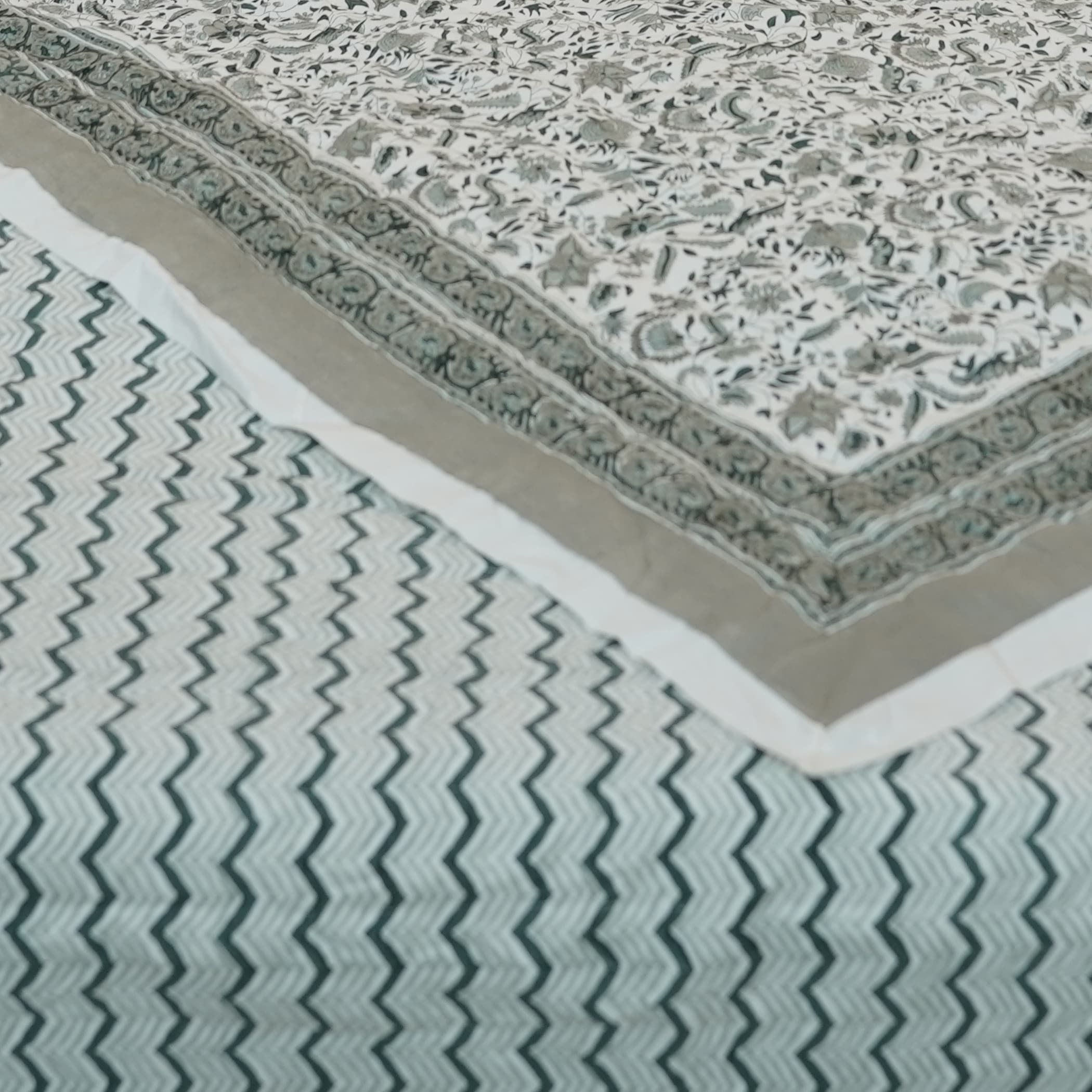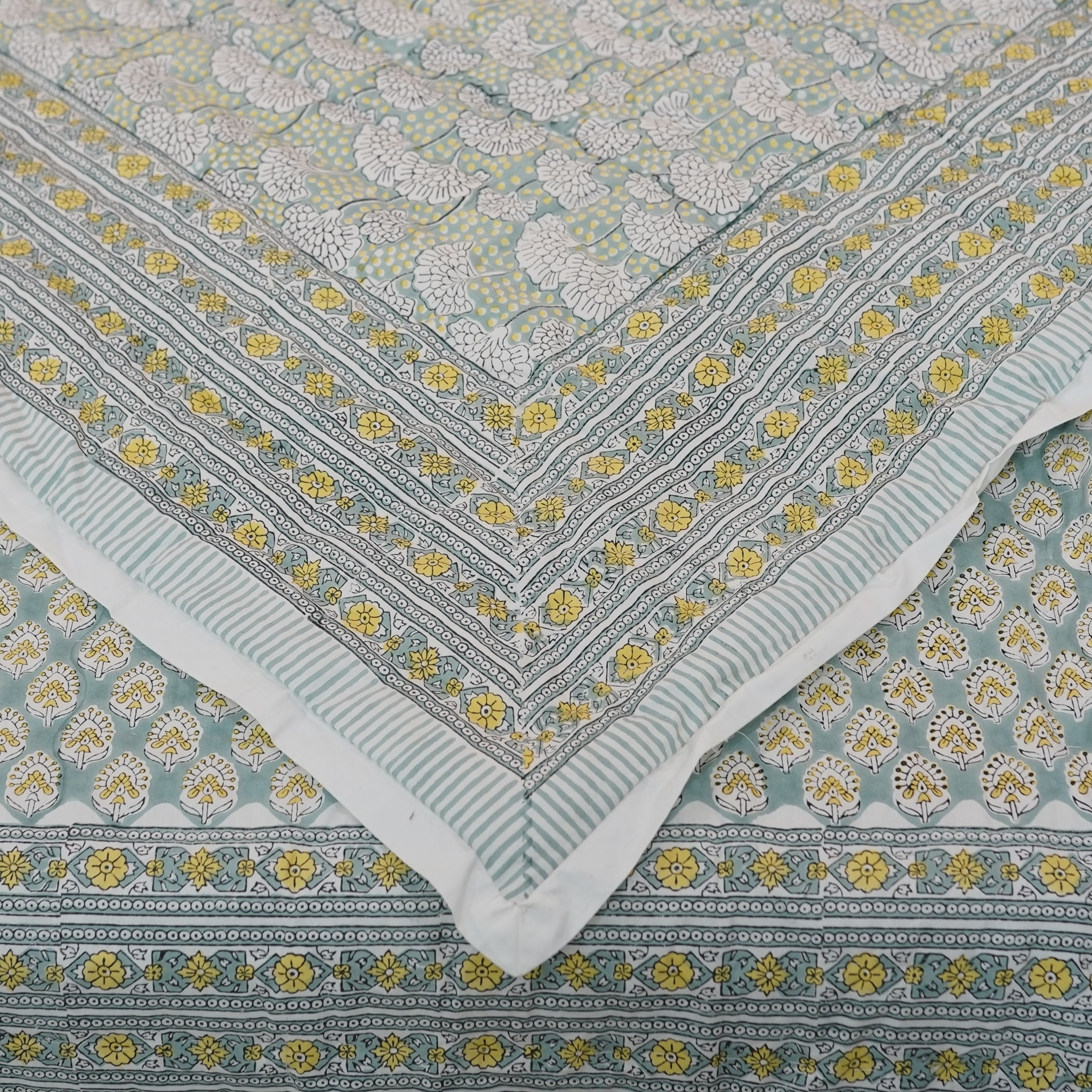Fabdivine Handmade Cotton Quilt Green White Floral, Reversible Eco-Chic Bed Layer, Textured Decorative Quilt for Modern Interior