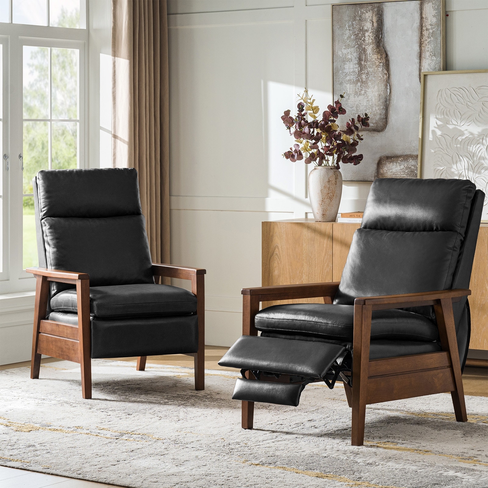 Gladys Mid-Century Modern Genuine Leather Solid Wood Recliner Set of 2 By HULALA HOME