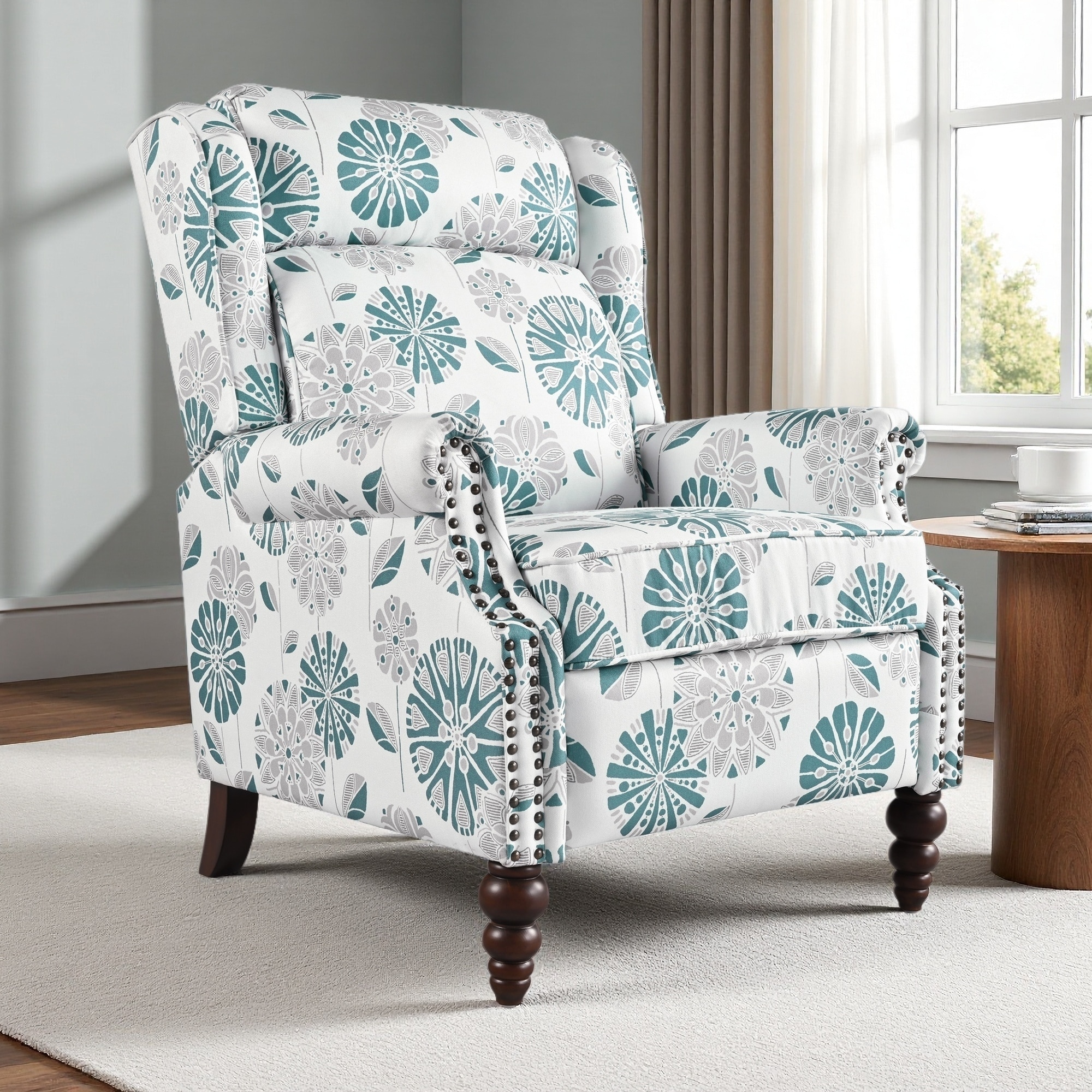 Chenille Push Back Recliner Chair with Wing Back and Gourd-shaped Wooden Legs