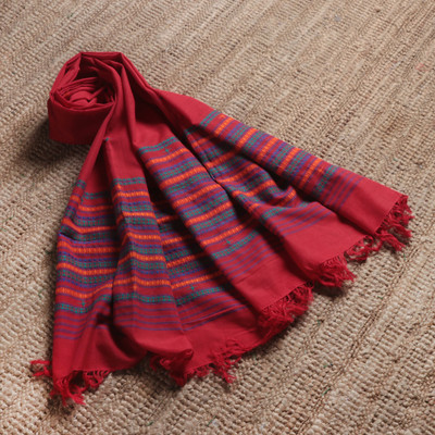 Candy Apple Ways,'Handwoven 100% Cotton Fringed Shawl in a Candy Apple Red Hue'