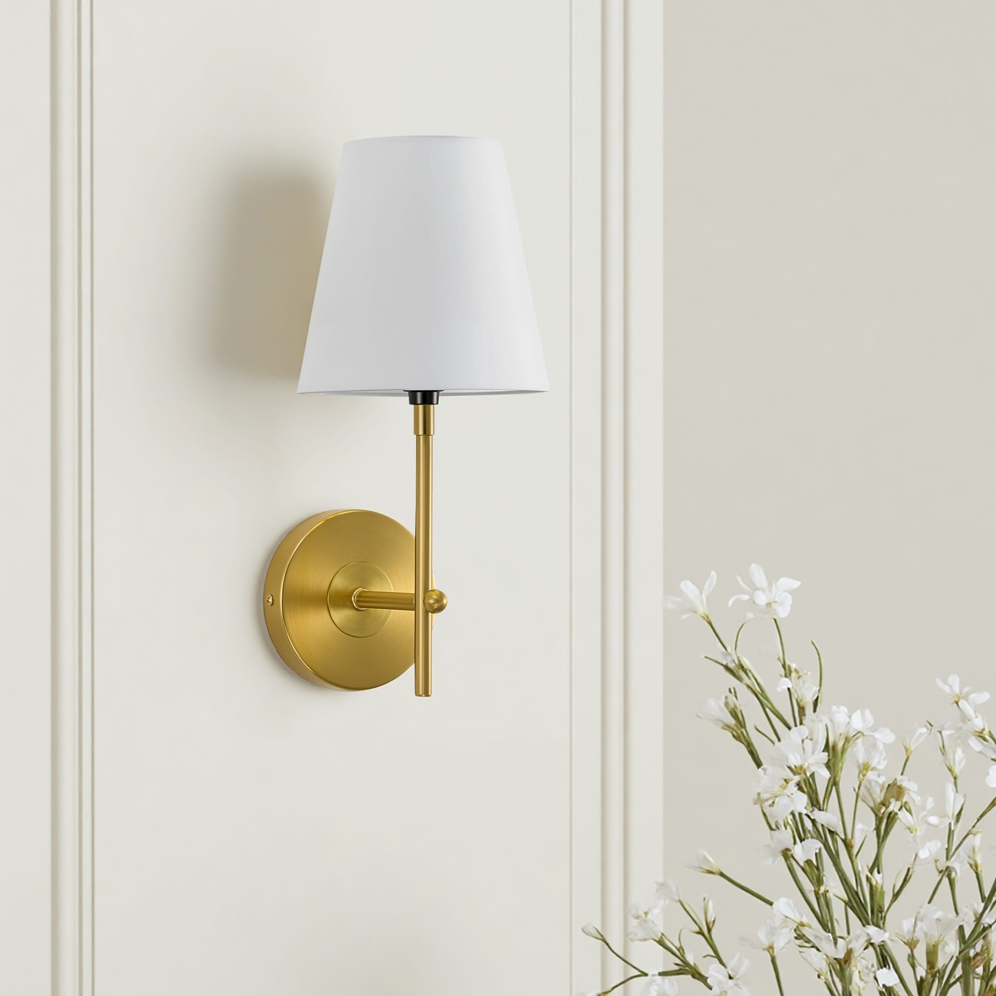 5" W x 10.25" H 1-Light Wallchiere Sconce in Matte Brass with Clear Acrylic Accents and Cylindrical White Fabric Shades