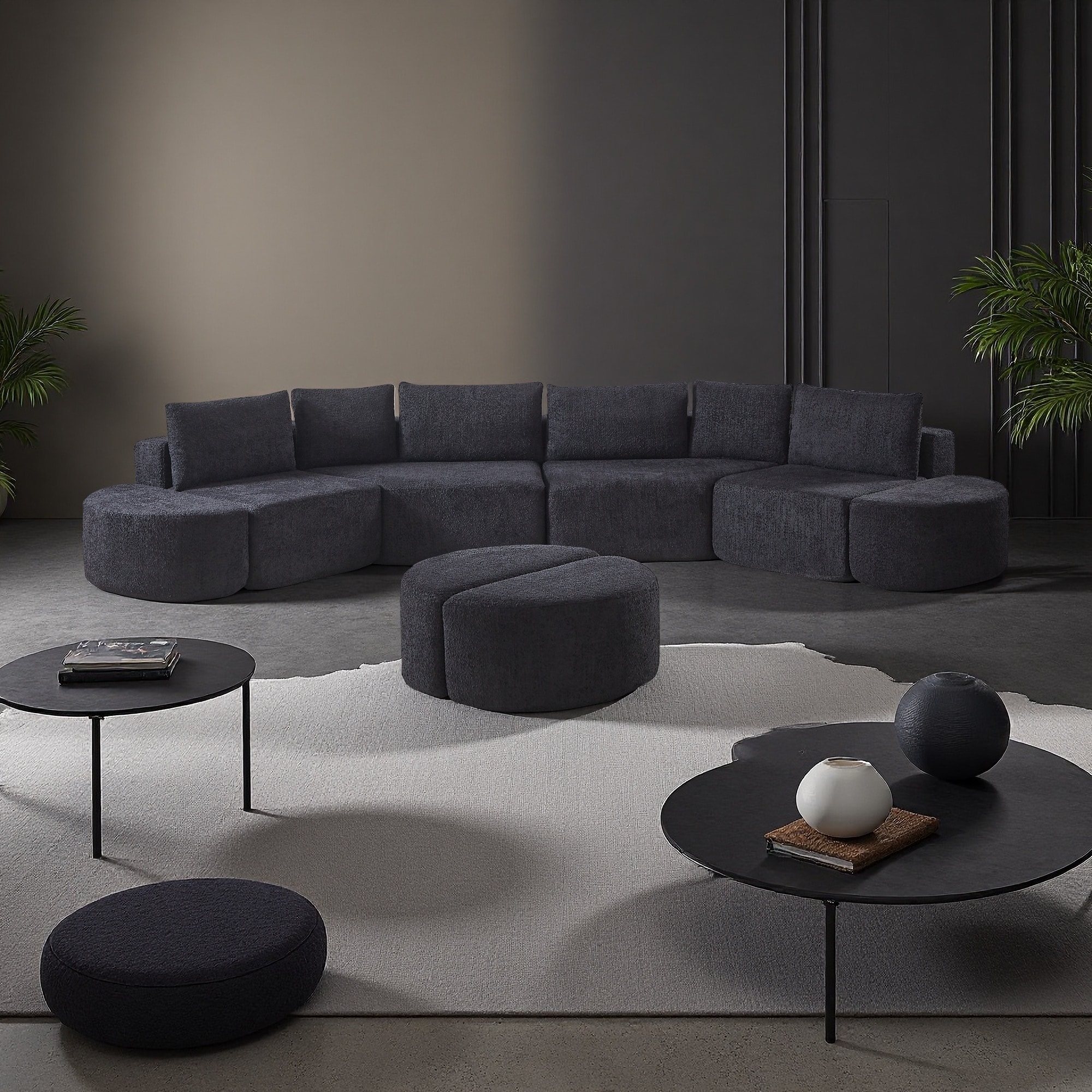 173" Chenille Modular Sectional Sofa with 6 Decorative Pillows and 4 Curved Footstools (5-Seater)