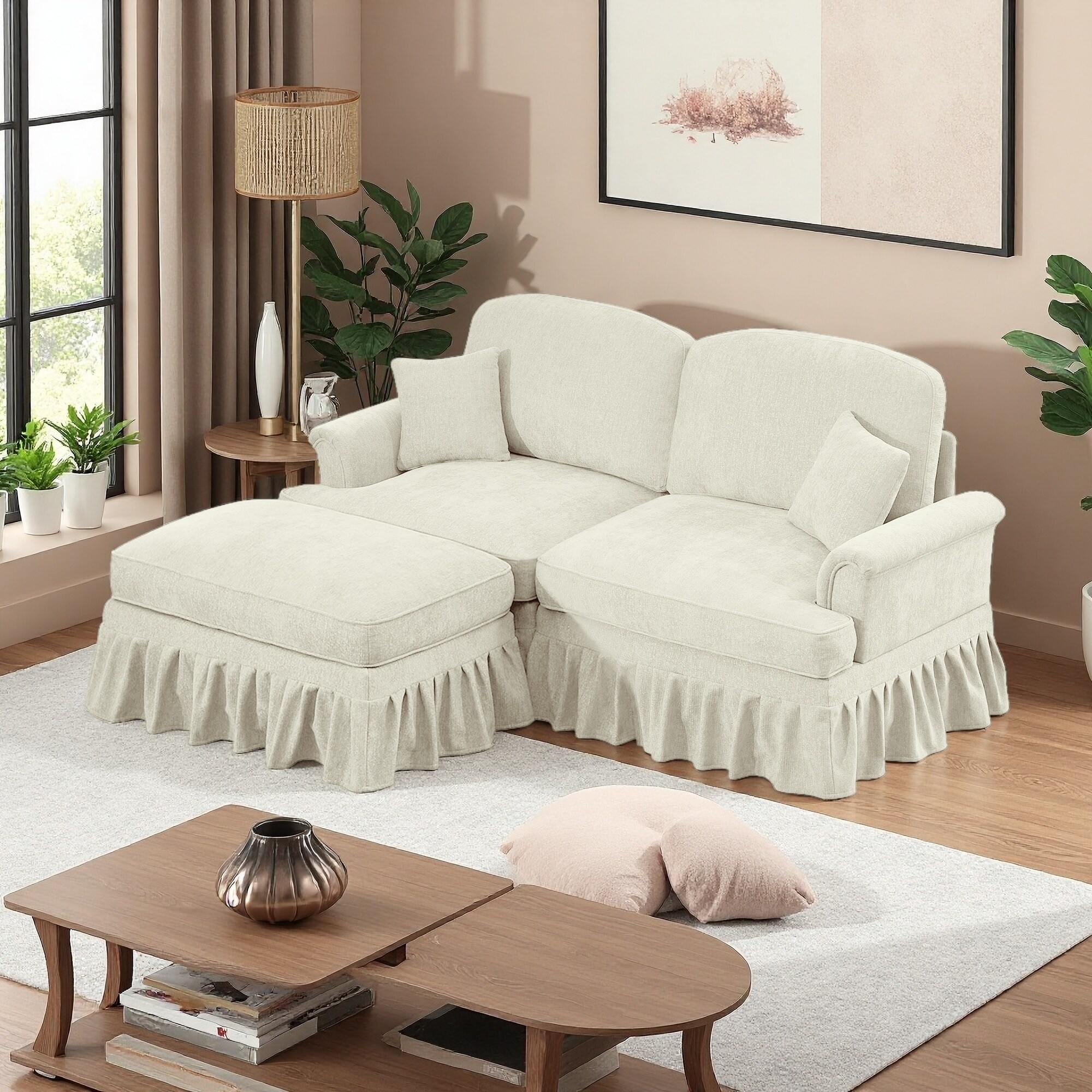 76.4" Chenille Mid-Century Modular L-Shaped Sofa with Flared Arms, Removable Skirt and Movable Ottoman (2-Seater)