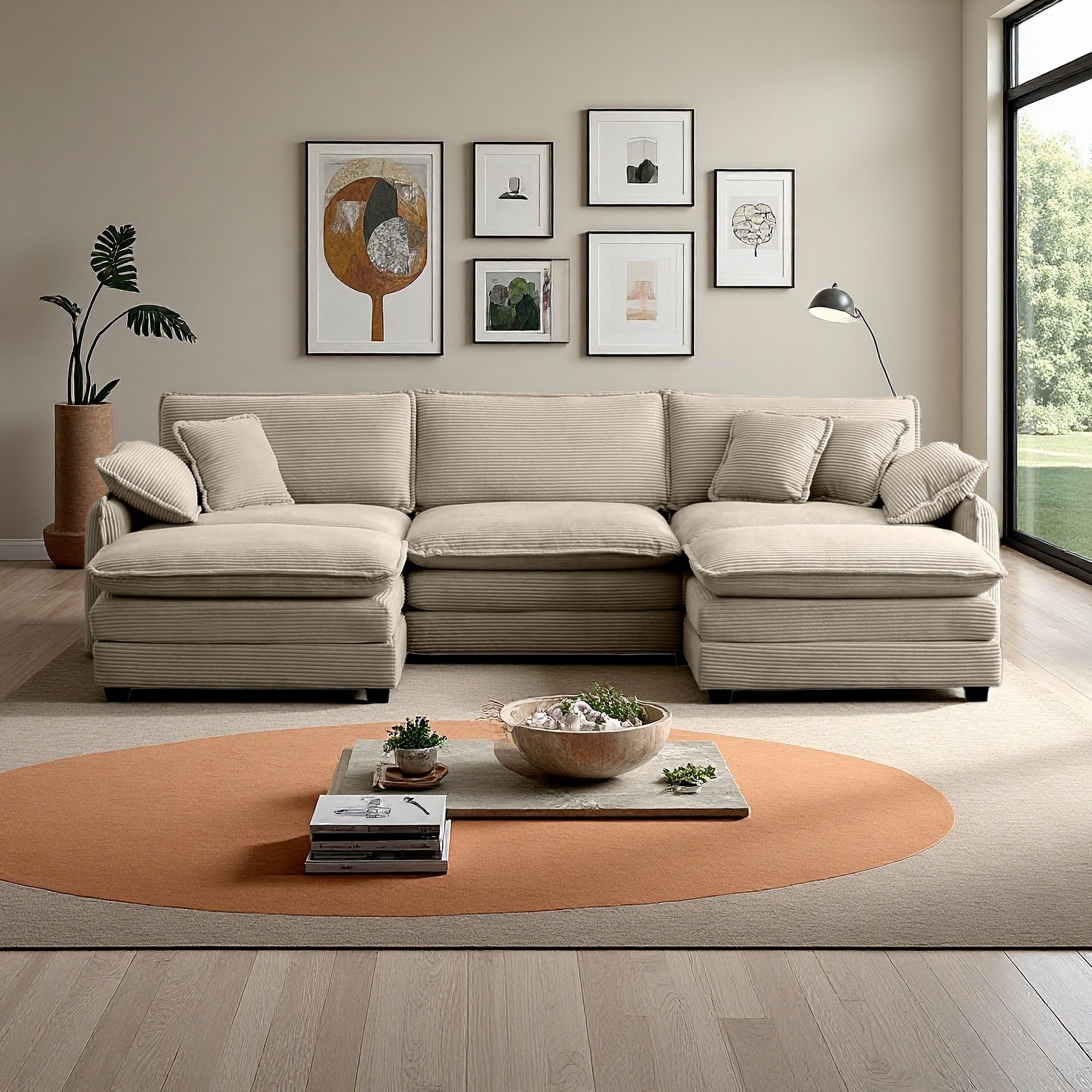 L-Shaped Sectional Couch with Ottoman, Oversized Modular Corduroy Sofa