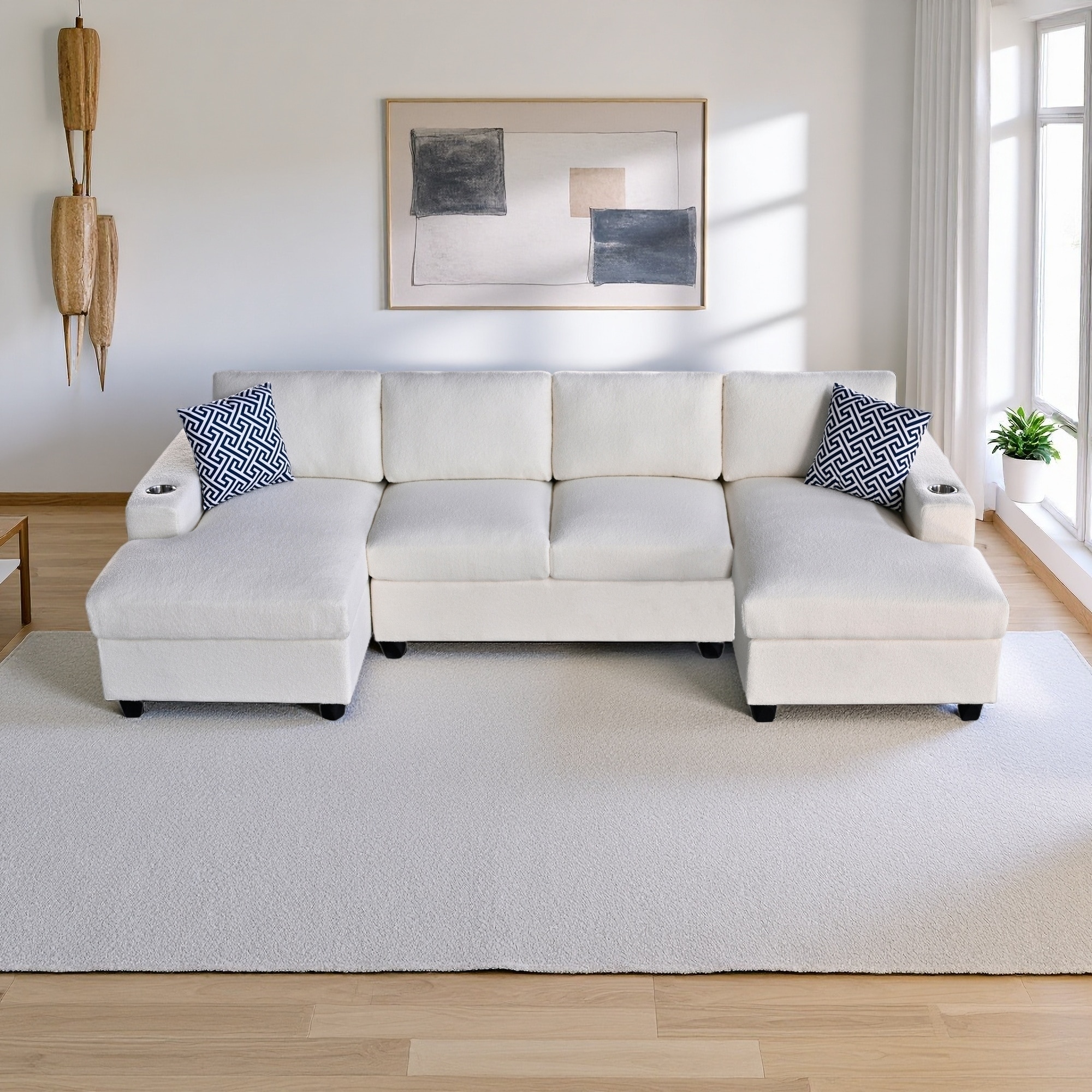 124" Wool U-Shaped 4-Seat Sectional Sofa with Cup Holders & Chaise Lounges