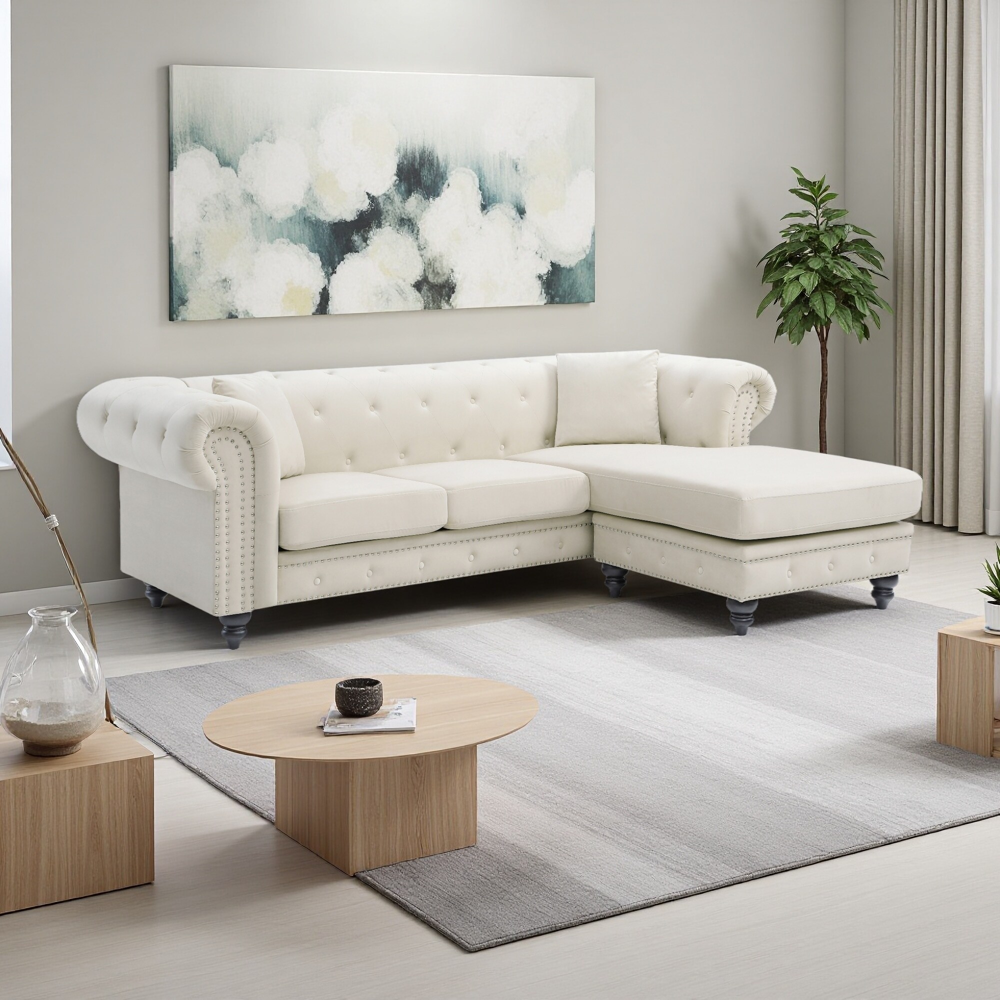98" Velvet 3-Seater Sofa Chaise with Tufted Back, Chrome Nailheads and Wooden Legs