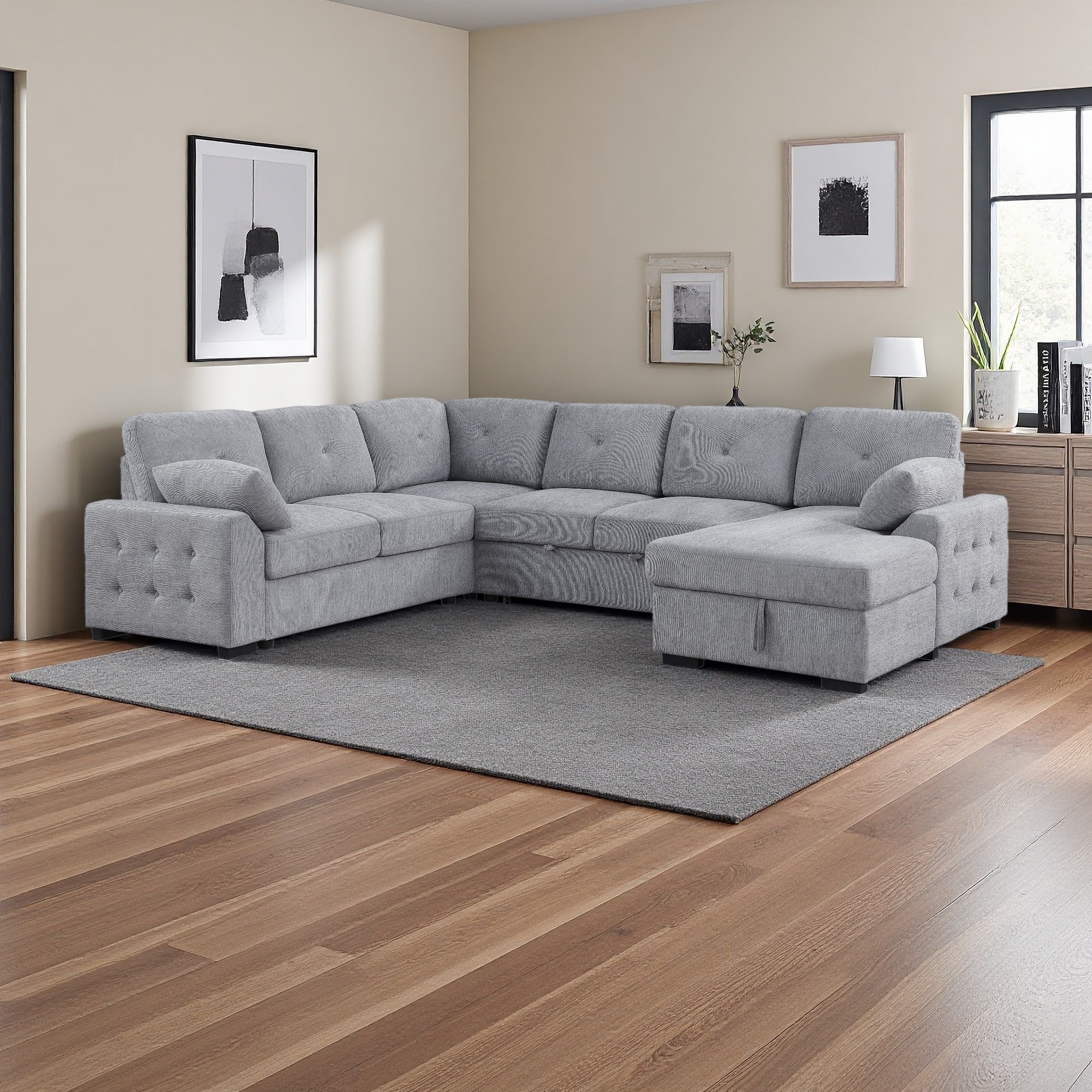 91" Chenille L-Shaped 5-Seater Sectional Sofa with Pull-Out Sleeper, Storage Chaise and Toss Pillows