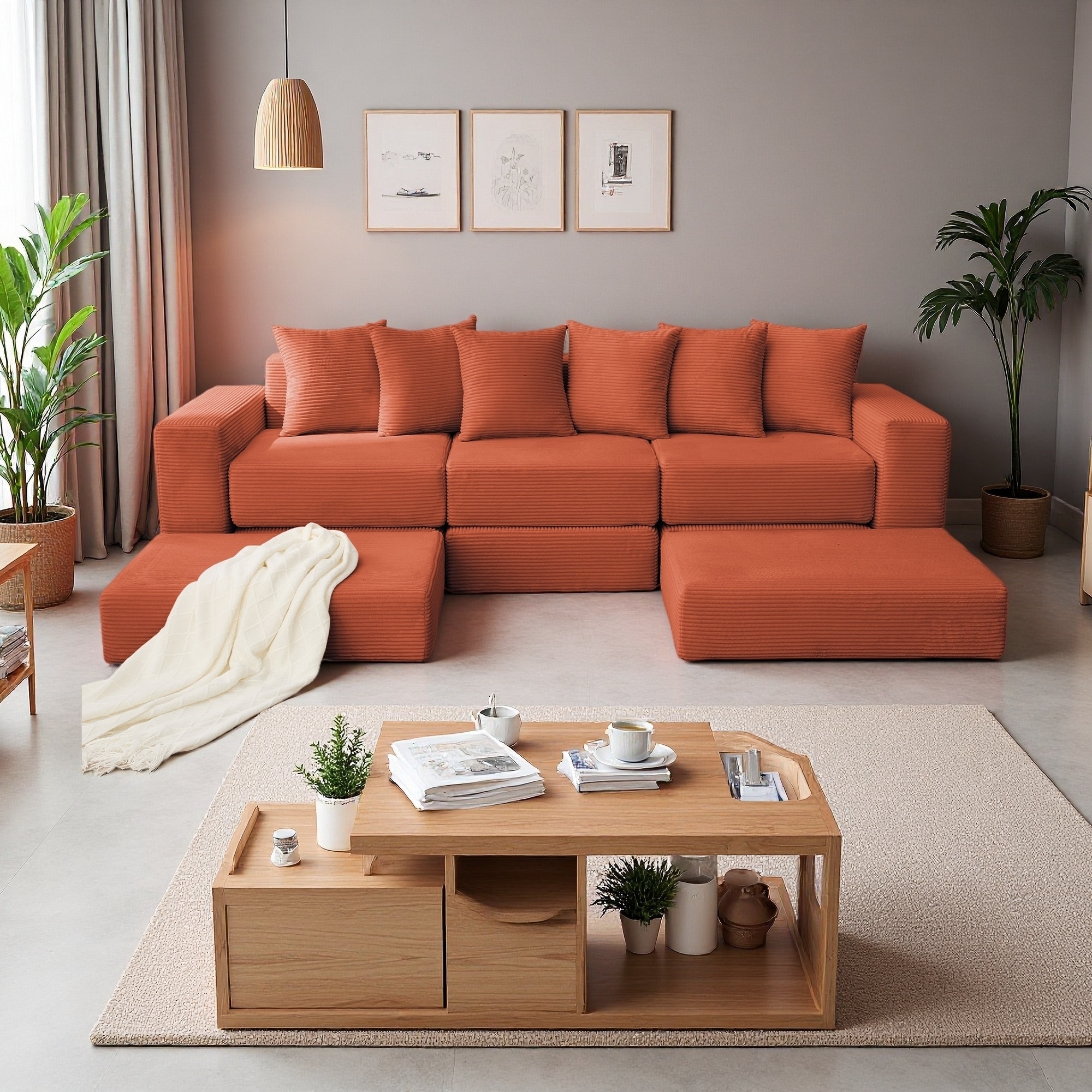 3-Seat Corduroy Modular Sofa with an Independent Removable Ottoman for Living Room or Business