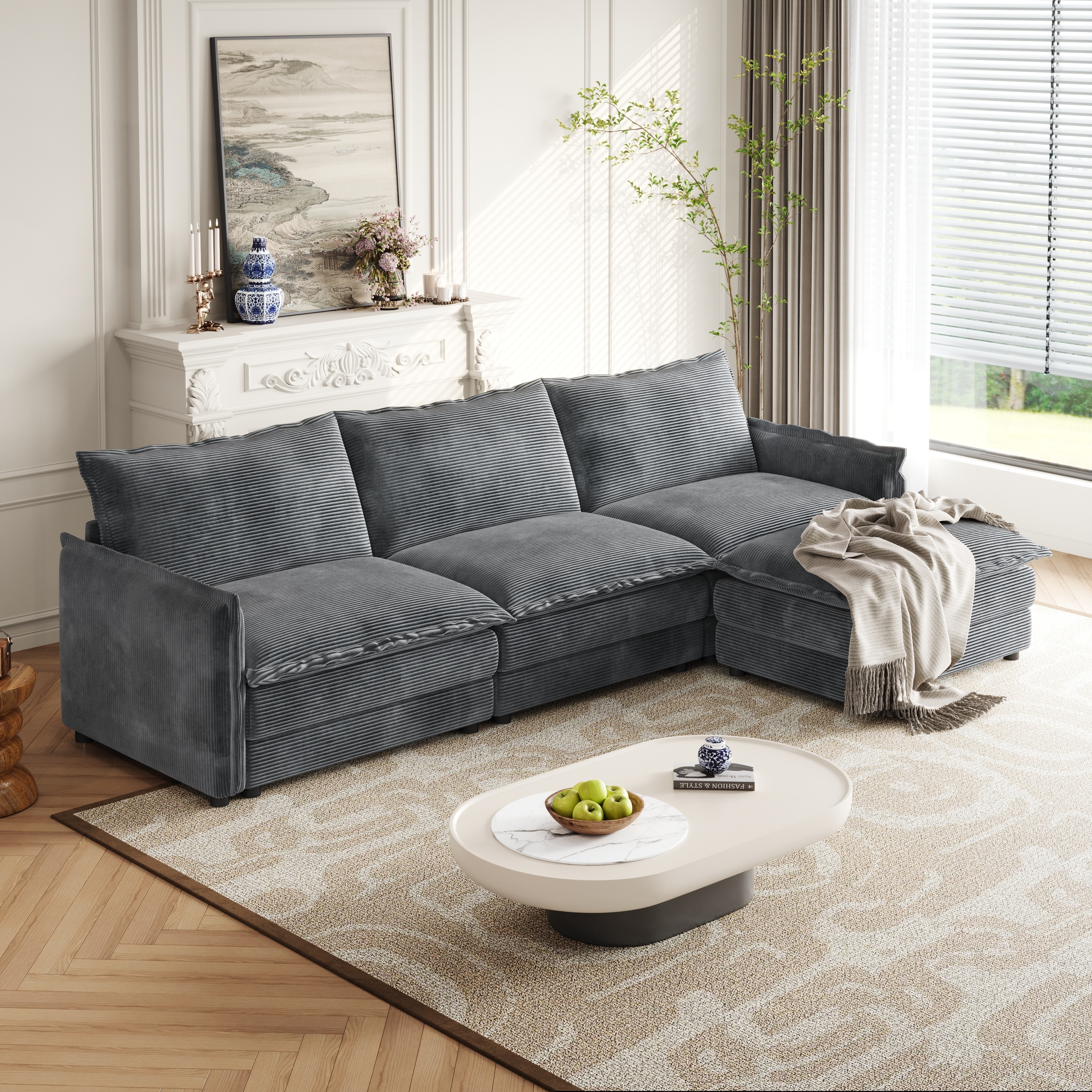 Corduroy Modular Deep Seat Couch L-shaped Sectional Sofa with Ottoman