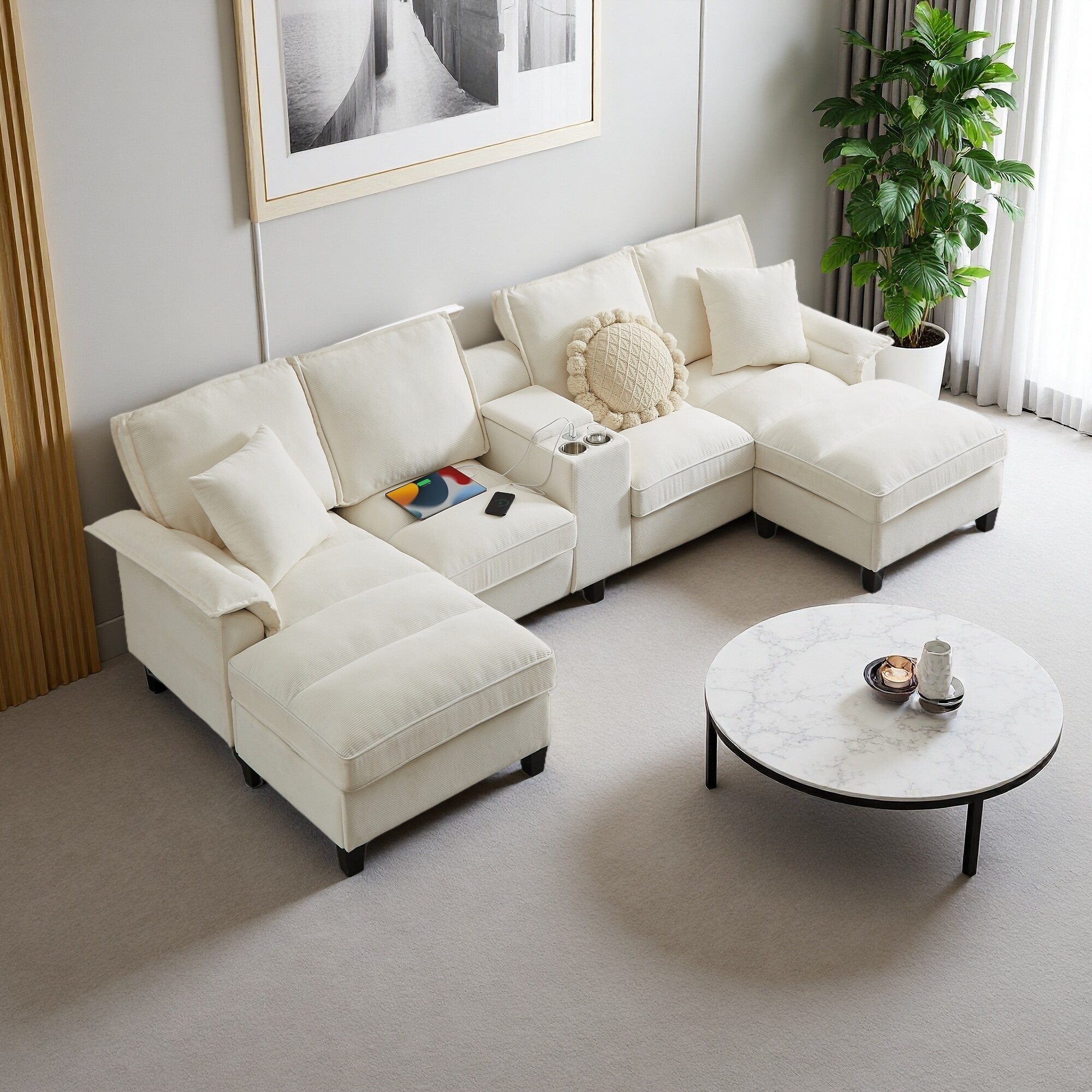 121" Corduroy U-Shaped 4-Seat Sectional Sofa with Storage, Cup Holders and Sleeper Function