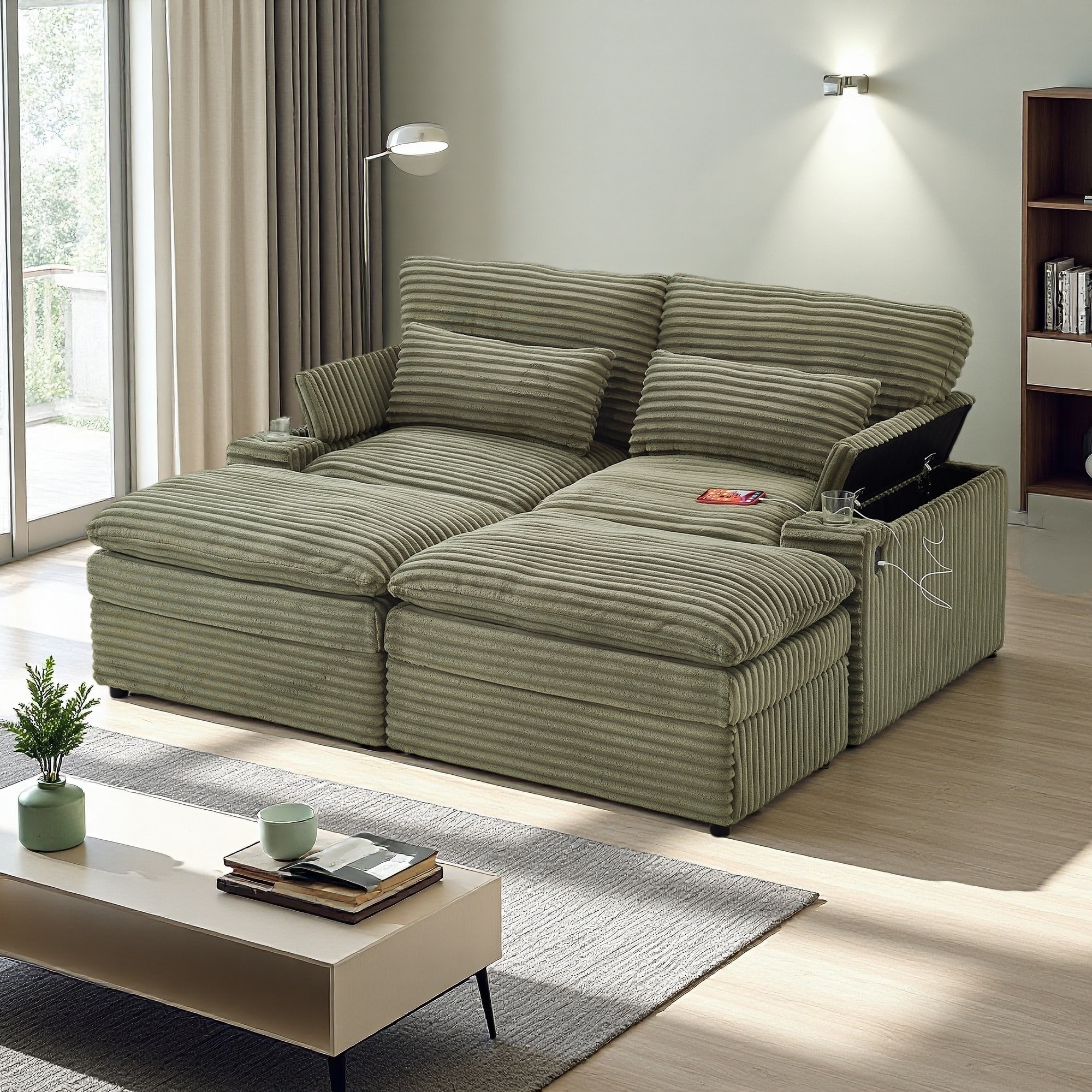 70.9" Corduroy Convertible 4-Seat Sectional Sofa Bed with Storage, Ottomans, USB & Cup Holders