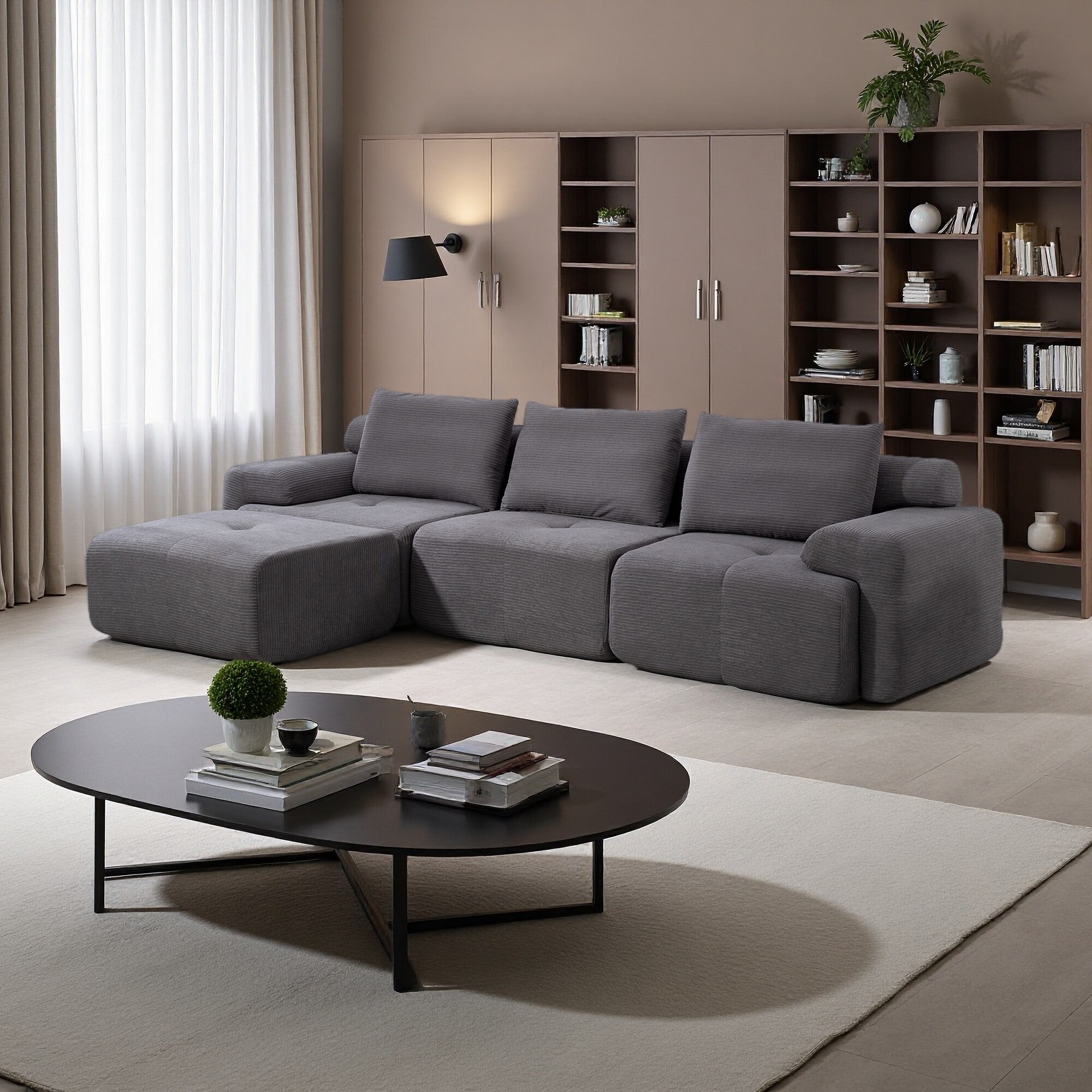 117.3" Corduroy L-Shaped 3-Seater Sectional Sofa with Deep Seat, 1 Ottoman & Pillows