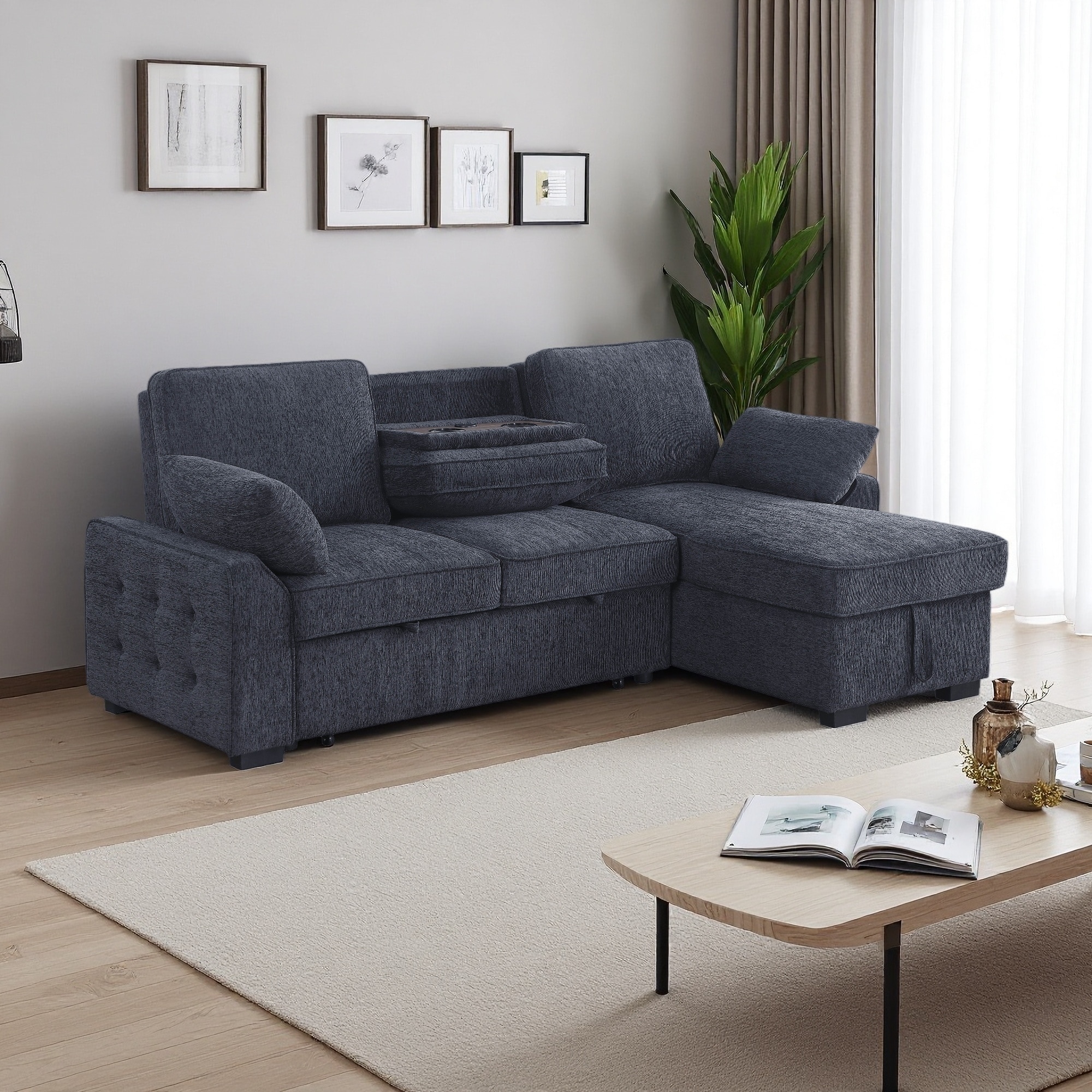 Pull-out Sectional Sofa Convertible Sofa Bed, U-Shaped Upholstered Sofa wStorage Chaise, Cup Holders, USB Ports and Pockets