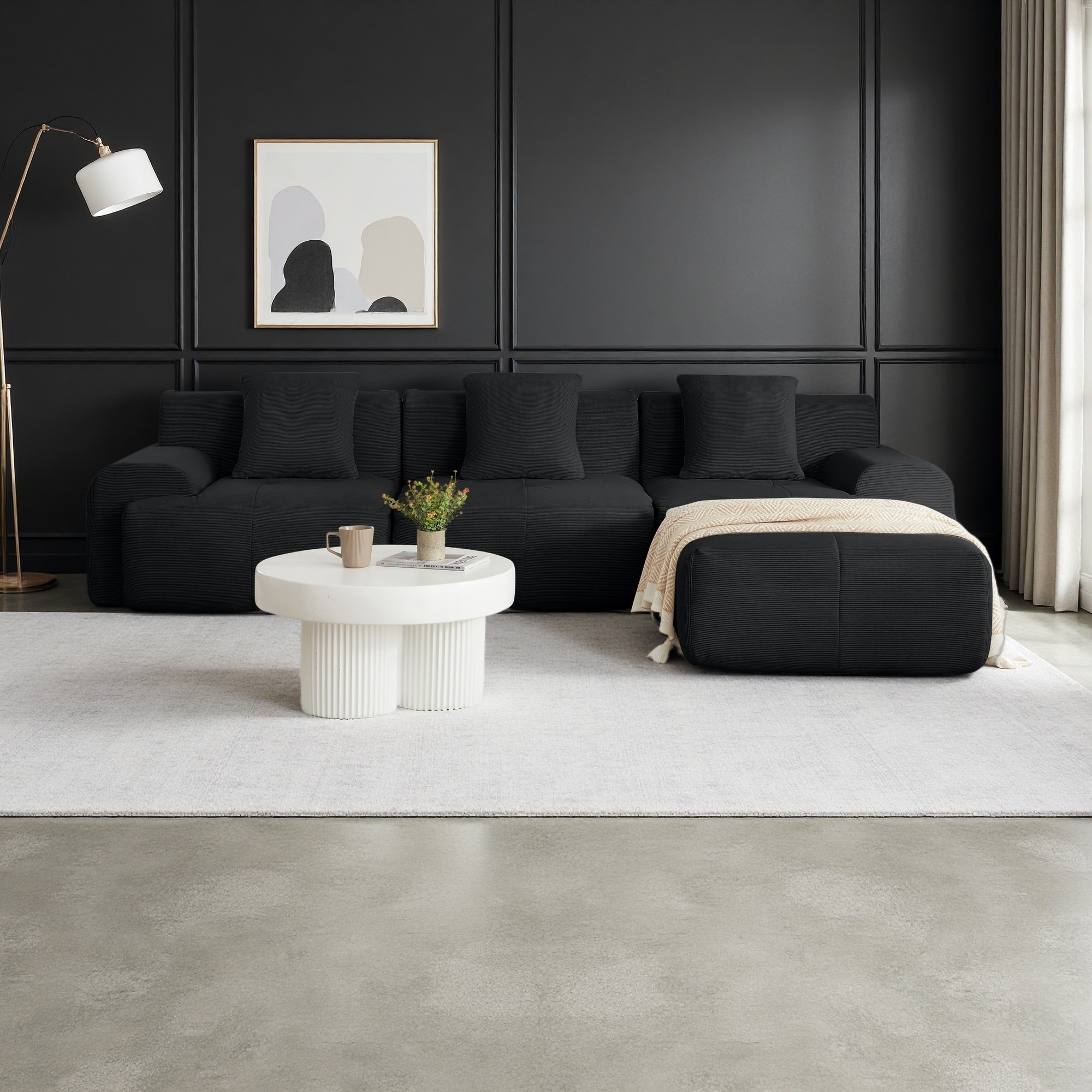 L-Shaped Modular Sectional Sofa with Ottoman, Corduroy Upholstered Boneless Couch, Deep Seat Sofa with Throw Pillows
