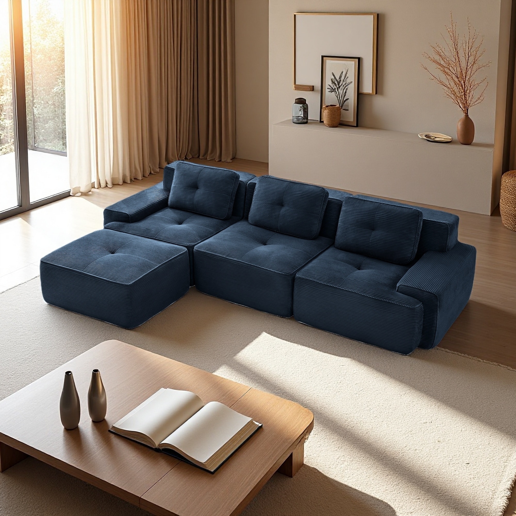117.3" Corduroy L-Shaped Modular Sectional Sofa with Deep Seat, Movable Ottoman and Tufted Design