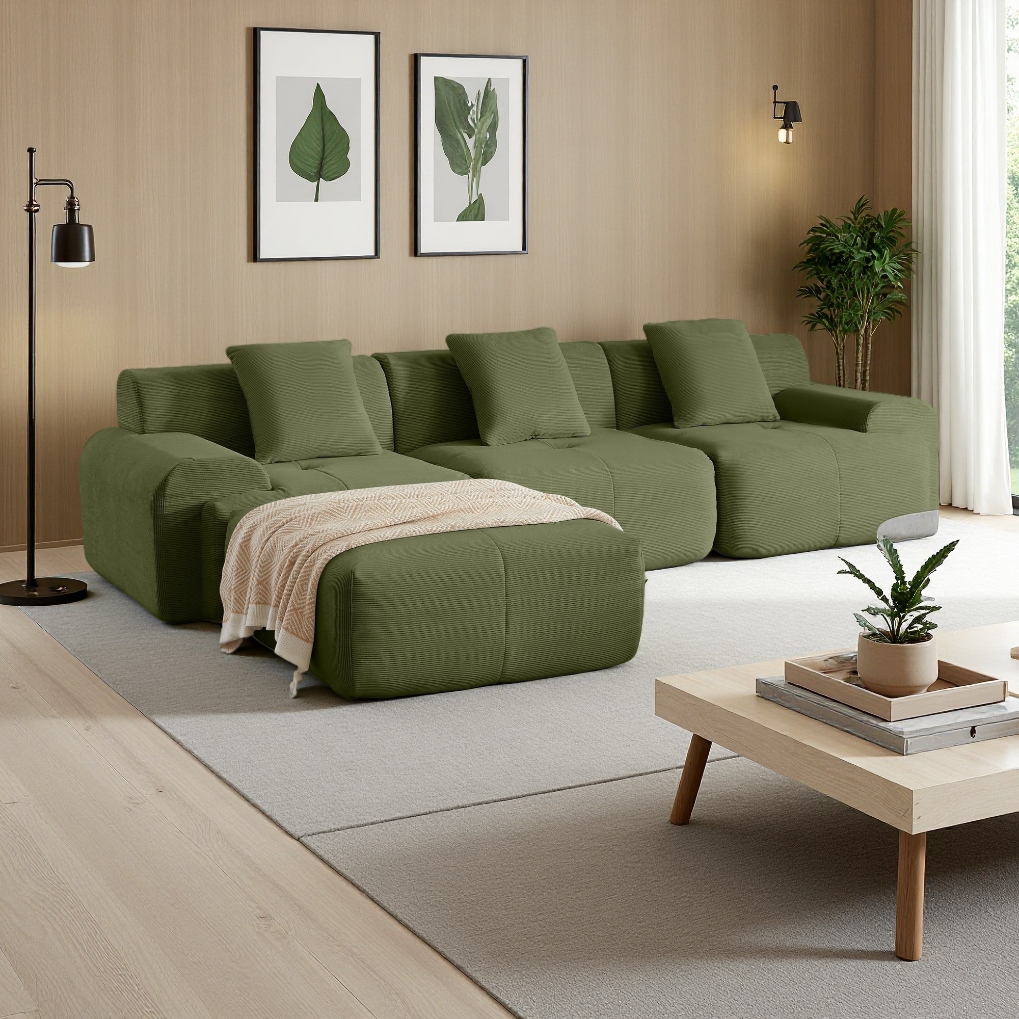 113" Corduroy L-Shaped 3-Seat Sectional Sofa with Deep Seat and Movable Ottoman
